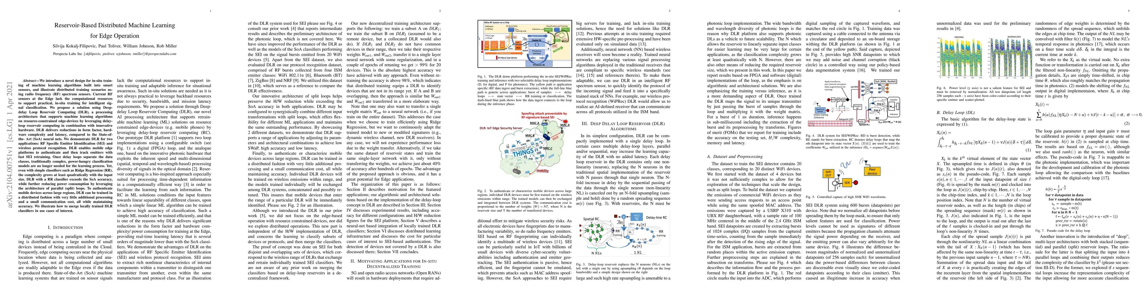 We introduce a novel design for in-situ training of machine learning algorithms built into smart sensors, and illustrate distributed training scenarios using radio frequency (RF) spectrum sensors. Current RF sensors at the Edge lack the computational resources to support practical, in-situ training for intelligent signal classification. We propose a solution using Deepdelay Loop Reservoir Computing (DLR), a processing architecture that supports machine learning algorithms on resource-constrained edge-devices by leveraging delayloop reservoir computing in combination with innovative hardware. DLR delivers reductions in form factor, hardware complexity and latency, compared to the State-ofthe- Art (SoA) neural nets. We demonstrate DLR for two applications: RF Specific Emitter Identification (SEI) and wireless protocol recognition. DLR enables mobile edge platforms to authenticate and then track emitters with fast SEI retraining. Once delay loops separate the data classes, traditionally complex, power-hungry classification models are no longer needed for the learning process. Yet, even with simple classifiers such as Ridge Regression (RR), the complexity grows at least quadratically with the input size. DLR with a RR classifier exceeds the SoA accuracy, while further reducing power consumption by leveraging the architecture of parallel (split) loops. To authenticate mobile devices across large regions, DLR can be trained in a distributed fashion with very little additional processing and a small communication cost, all while maintaining accuracy. We illustrate how to merge locally trained DLR classifiers in use cases of interest.