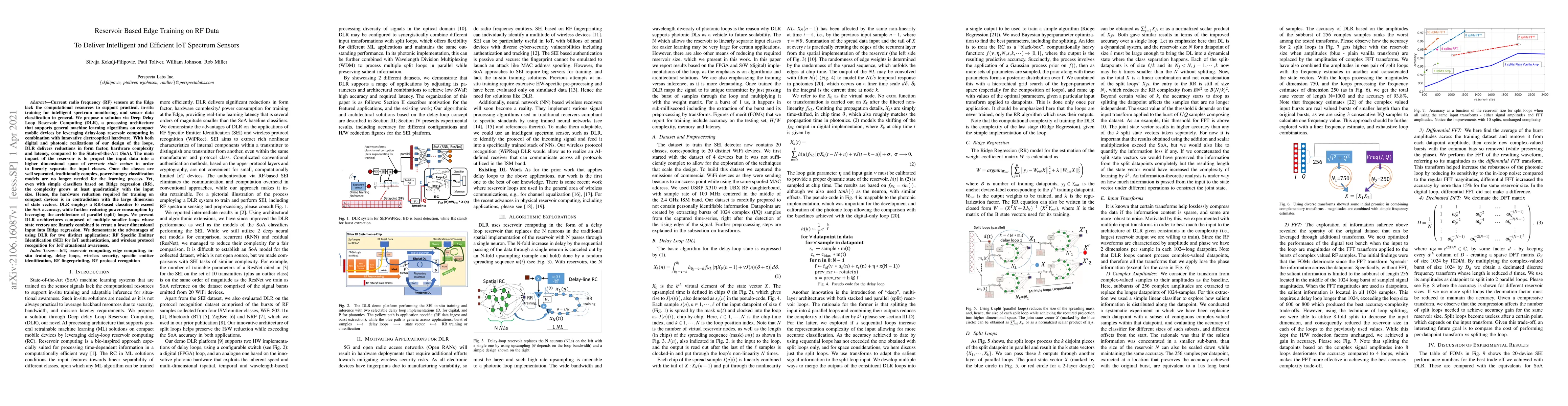 Current radio frequency (RF) sensors at the Edge lack the computational resources to support practical, in-situ training for intelligent spectrum monitoring, and sensor data classification in general. We propose a solution via Deep Delay Loop Reservoir Computing (DLR), a processing architecture that supports general machine learning algorithms on compact mobile devices by leveraging delay-loop reservoir computing in combination with innovative electrooptical hardware. With both digital and photonic realizations of our design of the loops, DLR delivers reductions in form factor, hardware complexity and latency, compared to the State-of-the-Art (SoA). The main impact of the reservoir is to project the input data into a higher dimensional space of reservoir state vectors in order to linearly separate the input classes. Once the classes are well separated, traditionally complex, power-hungry classification models are no longer needed for the learning process. Yet, even with simple classifiers based on Ridge regression (RR), the complexity grows at least quadratically with the input size. Hence, the hardware reduction required for training on compact devices is in contradiction with the large dimension of state vectors. DLR employs a RR-based classifier to exceed the SoA accuracy, while further reducing power consumption by leveraging the architecture of parallel (split) loops. We present DLR architectures composed of multiple smaller loops whose state vectors are linearly combined to create a lower dimensional input into Ridge regression. We demonstrate the advantages of using DLR for two distinct applications: RF Specific Emitter Identification (SEI) for IoT authentication, and wireless protocol recognition for IoT situational awareness.