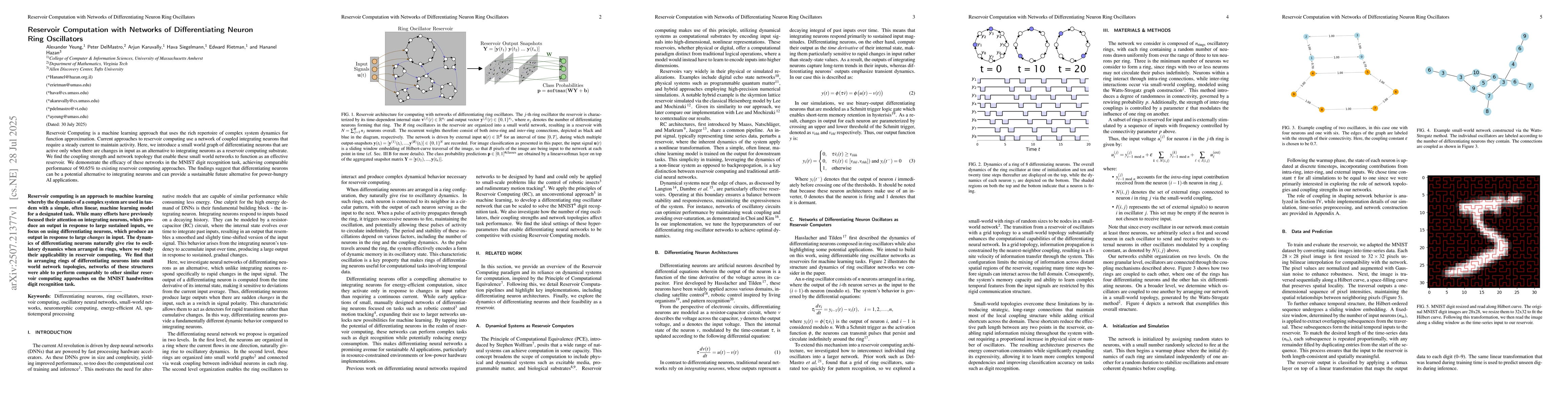 The paper presents a novel reservoir computing architecture using differentiating neuron ring oscillators in a small-world network topology, demonstrating its effectiveness in a digit recognition task.