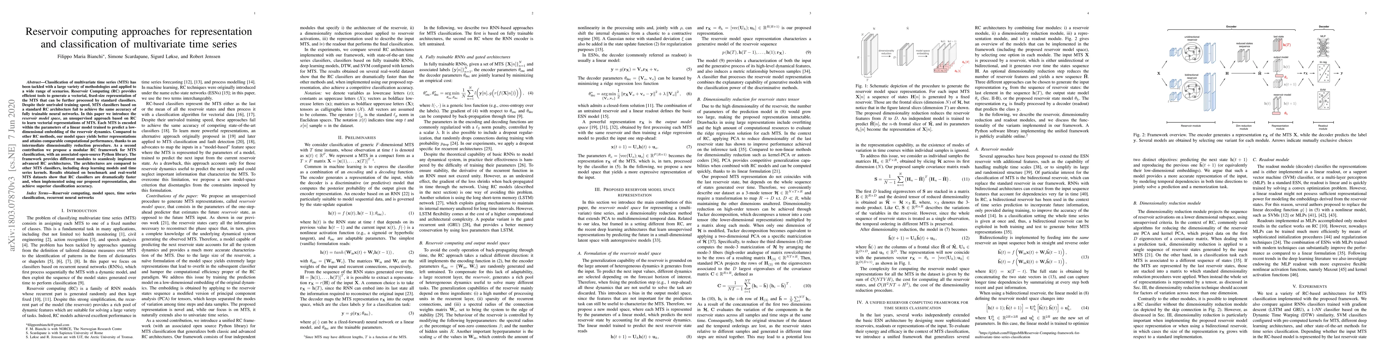 Classification of multivariate time series (MTS) has been tackled with a large variety of methodologies and applied to a wide range of scenarios. Reservoir Computing (RC) provides efficient tools to generate a vectorial, fixed-size representation of the MTS that can be further processed by standard classifiers. Despite their unrivaled training speed, MTS classifiers based on a standard RC architecture fail to achieve the same accuracy of fully trainable neural networks. In this paper we introduce the reservoir model space, an unsupervised approach based on RC to learn vectorial representations of MTS. Each MTS is encoded within the parameters of a linear model trained to predict a low-dimensional embedding of the reservoir dynamics. Compared to other RC methods, our model space yields better representations and attains comparable computational performance, thanks to an intermediate dimensionality reduction procedure. As a second contribution we propose a modular RC framework for MTS classification, with an associated open-source Python library. The framework provides different modules to seamlessly implement advanced RC architectures. The architectures are compared to other MTS classifiers, including deep learning models and time series kernels. Results obtained on benchmark and real-world MTS datasets show that RC classifiers are dramatically faster and, when implemented using our proposed representation, also achieve superior classification accuracy.