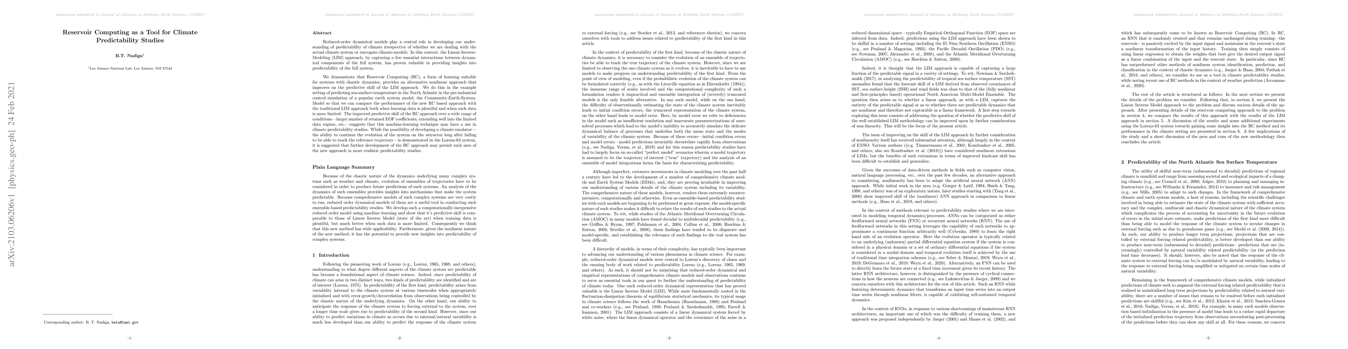 Reduced-order dynamical models play a central role in developing our understanding of predictability of climate irrespective of whether we are dealing with the actual climate system or surrogate climate-models. In this context, the Linear-Inverse-Modeling (LIM) approach, by capturing a few essential interactions between dynamical components of the full system, has proven valuable in providing insights into predictability of the full system. We demonstrate that Reservoir Computing (RC), a form of learning suitable for systems with chaotic dynamics, provides an alternative nonlinear approach that improves on the predictive skill of the LIM approach. We do this in the example setting of predicting sea-surface-temperature in the North Atlantic in the pre-industrial control simulation of a popular earth system model, the Community-Earth-System-Model so that we can compare the performance of the new RC based approach with the traditional LIM approach both when learning data is plentiful and when such data is more limited. The improved predictive skill of the RC approach over a wide range of conditions -- larger number of retained EOF coefficients, extending well into the limited data regime, etc. -- suggests that this machine-learning technique may have a use in climate predictability studies. While the possibility of developing a climate emulator -- the ability to continue the evolution of the system on the attractor long after failing to be able to track the reference trajectory -- is demonstrated in the Lorenz-63 system, it is suggested that further development of the RC approach may permit such uses of the new approach in more realistic predictability studies.
