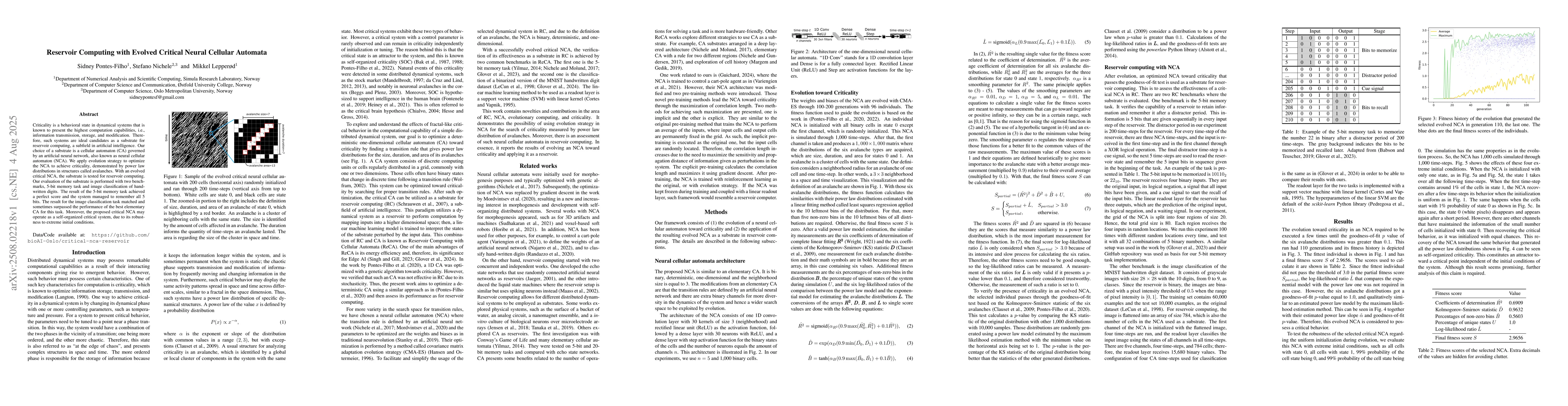 Criticality is a behavioral state in dynamical systems that is known to present the highest computation capabilities, i.e., information transmission, storage, and modification. Therefore, such systems are ideal candidates as a substrate for reservoir computing, a subfield in artificial intelligence. Our choice of a substrate is a cellular automaton (CA) governed by an artificial neural network, also known as neural cellular automaton (NCA). We apply evolution strategy to optimize the NCA to achieve criticality, demonstrated by power law distributions in structures called avalanches. With an evolved critical NCA, the substrate is tested for reservoir computing. Our evaluation of the substrate is performed with two benchmarks, 5-bit memory task and image classification of handwritten digits. The result of the 5-bit memory task achieved a perfect score and the system managed to remember all 5 bits. The result for the image classification task matched and sometimes surpassed the performance of the best elementary CA for this task. Moreover, the proposed critical NCA may operate as a self-organized critical system, due to its robustness to extreme initial conditions.