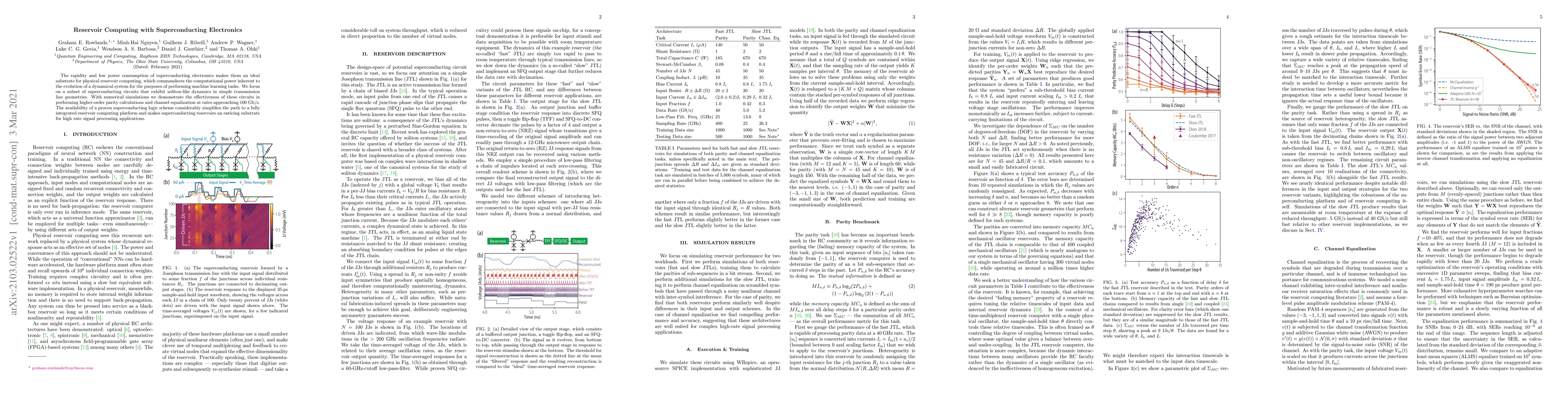 Superconducting electronics, known for their speed and low power, are shown to effectively perform machine learning tasks through physical reservoir computing. Numerical simulations demonstrate the capability of these circuits to execute higher-order parity calculations and channel equalization at near 100 Gb/s, highlighting the potential for high-rate signal processing applications.