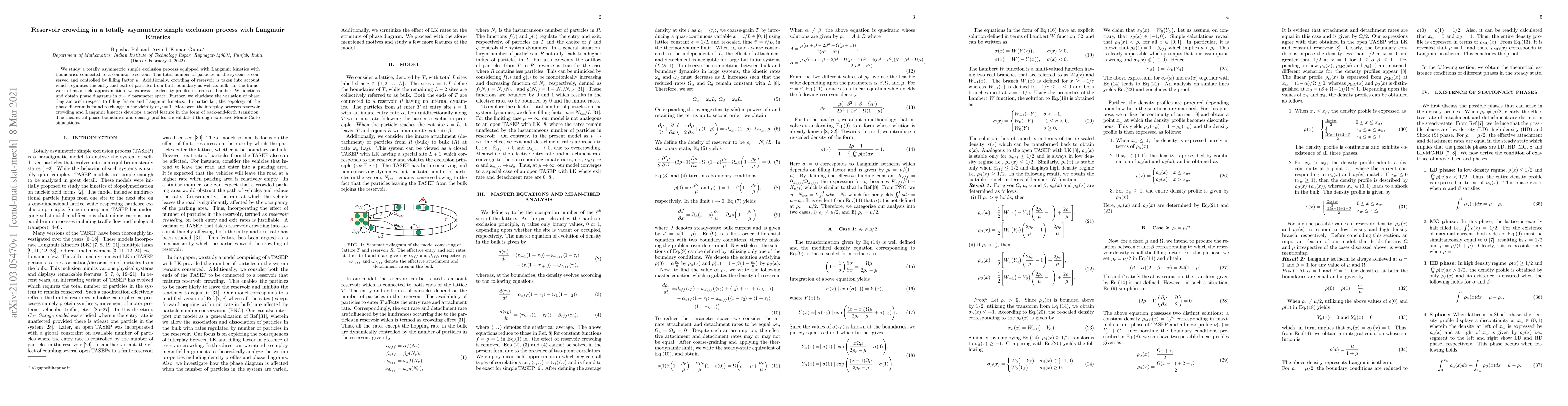 This paper investigates a totally asymmetric simple exclusion process with Langmuir kinetics, focusing on the effects of reservoir crowding on particle dynamics. Theoretical density profiles and phase diagrams are derived using mean-field approximation and validated through Monte Carlo simulations, revealing novel back-and-forth transitions influenced by the filling factor and Langmuir kinetics.