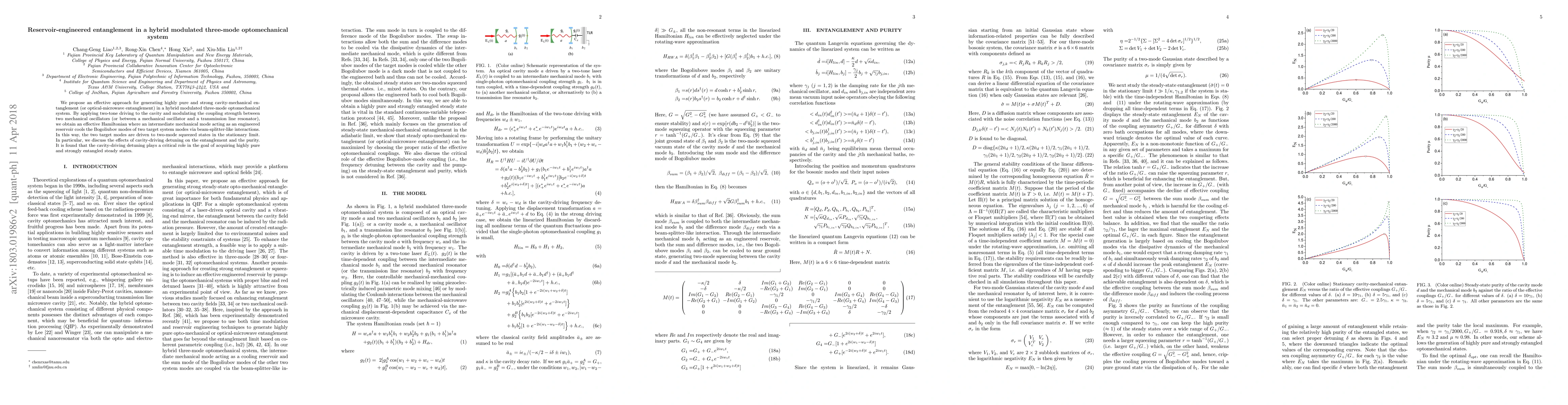 This paper proposes a method to generate highly pure and strong entanglement in a hybrid optomechanical system using a three-mode configuration. By employing two-tone driving and modulating the coupling strength, an engineered reservoir cools the target modes, leading to two-mode squeezed states, with cavity-driving detuning playing a crucial role in achieving the desired entanglement purity.