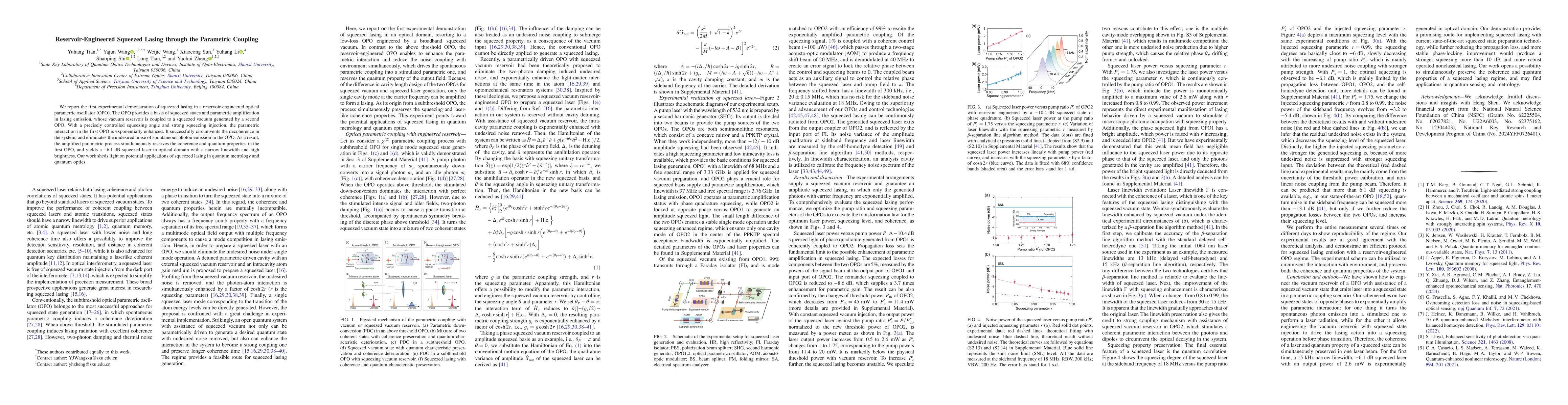 We report the first experimental demonstration of squeezed lasing in a reservoir-engineered optical parametric oscillator (OPO). The OPO provides a basis of squeezed states and parametric amplification in lasing emission, whose vacuum reservoir is coupled to a squeezed vacuum generated by a second OPO. With a precisely controlled squeezing angle and strong squeezing injection, the parametric interaction in the first OPO is exponentially enhanced. It successfully circumvents the decoherence in the system, and eliminates the undesired noise of spontaneous photon emission in the OPO. As a result, the amplified parametric process simultaneously reserves the coherence and quantum properties in the first OPO, and yields a -6.1 dB squeezed laser in optical domain with a narrow linewidth and high brightness. Our work sheds light on potential applications of squeezed lasing in quantum metrology and quantum optics.