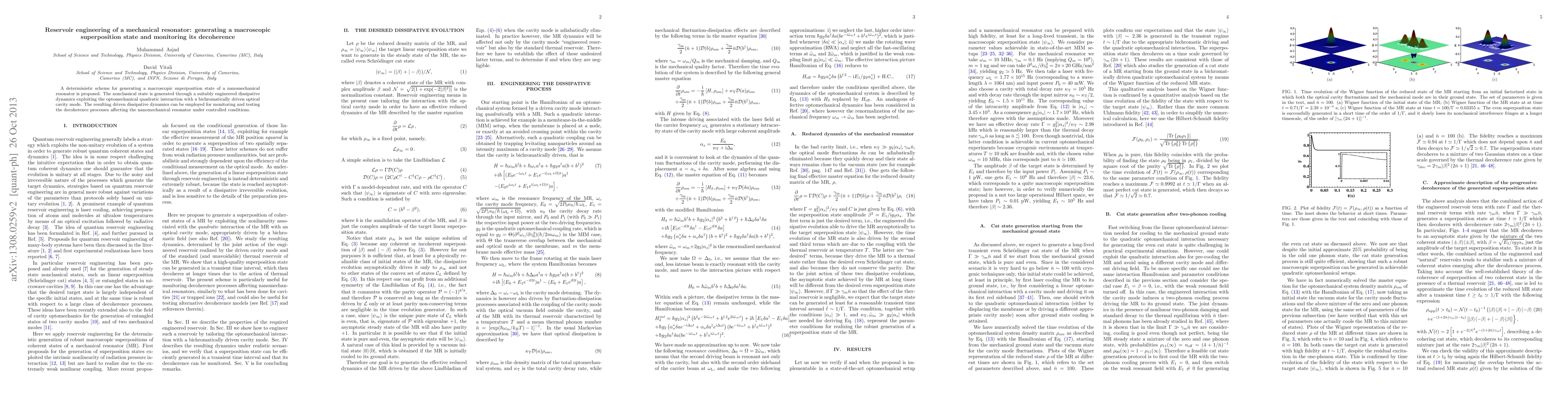 This paper proposes a method to generate a macroscopic superposition state in a nanomechanical resonator using optomechanical interaction and a bichromatically driven optical cavity. The scheme allows for monitoring and testing the decoherence processes affecting the resonator under controlled conditions.