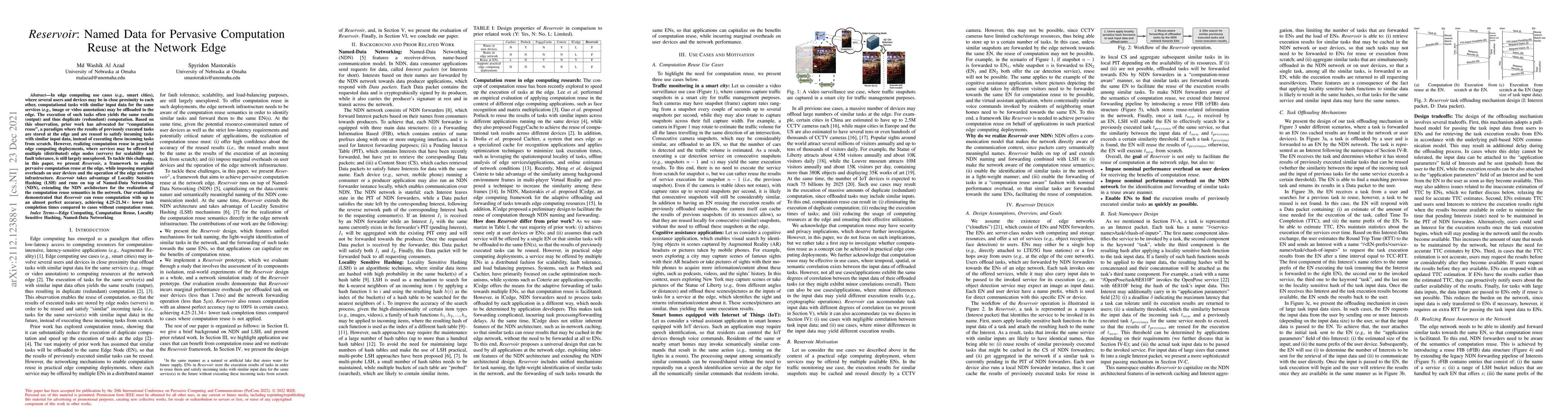 This paper introduces Reservoir, a framework for enabling pervasive computation reuse at the edge in edge computing environments like smart cities. It leverages Named-Data Networking (NDN) and Locality Sensitive Hashing (LSH) to minimize overheads while achieving up to 21x faster task completion times through effective reuse of previously computed results.