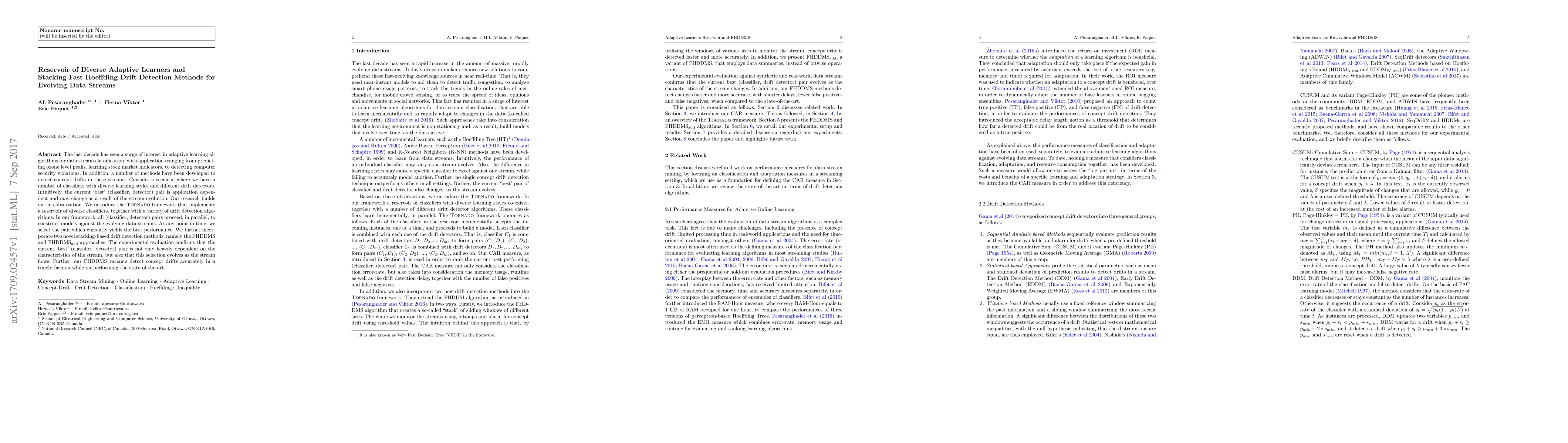 The paper proposes the $\mbox{Tornado}$ framework, which employs a reservoir of diverse adaptive learners and various fast Hoeffding drift detection methods to handle evolving data streams. The framework selects the best-performing (classifier, detector) pair dynamically, and introduces two novel stacking-based drift detection methods, $\mbox{FHDDMS}$ and $\mbox{FHDDMS}_{add}$, which outperform existing methods in detecting concept drifts accurately.
