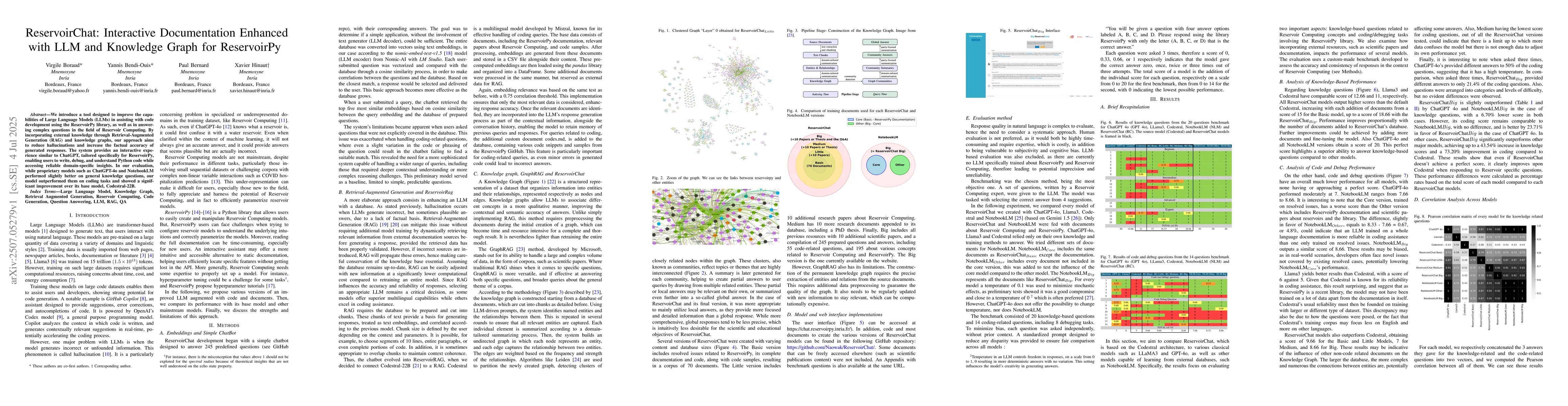 We introduce a tool designed to improve the capabilities of Large Language Models (LLMs) in assisting with code development using the ReservoirPy library, as well as in answering complex questions in the field of Reservoir Computing. By incorporating external knowledge through Retrieval-Augmented Generation (RAG) and knowledge graphs, our approach aims to reduce hallucinations and increase the factual accuracy of generated responses. The system provides an interactive experience similar to ChatGPT, tailored specifically for ReservoirPy, enabling users to write, debug, and understand Python code while accessing reliable domain-specific insights. In our evaluation, while proprietary models such as ChatGPT-4o and NotebookLM performed slightly better on general knowledge questions, our model outperformed them on coding tasks and showed a significant improvement over its base model, Codestral-22B.