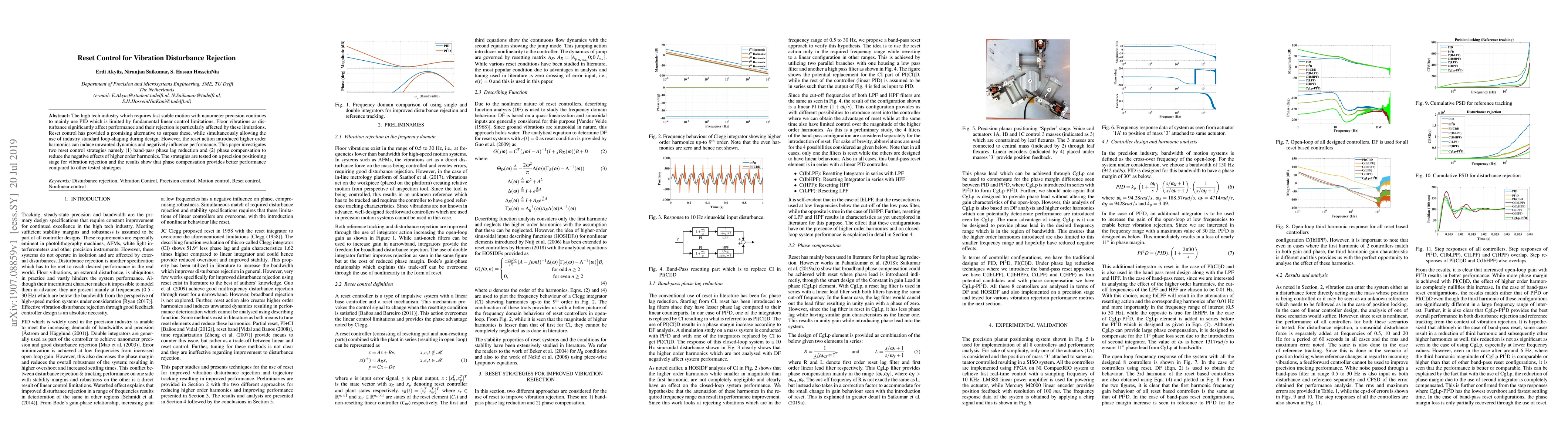 This paper explores reset control strategies to improve vibration disturbance rejection in high precision motion systems, addressing the limitations of traditional PID control. It evaluates two methods—band-pass phase lag reduction and phase compensation—showing that phase compensation effectively mitigates unwanted dynamics and enhances performance.