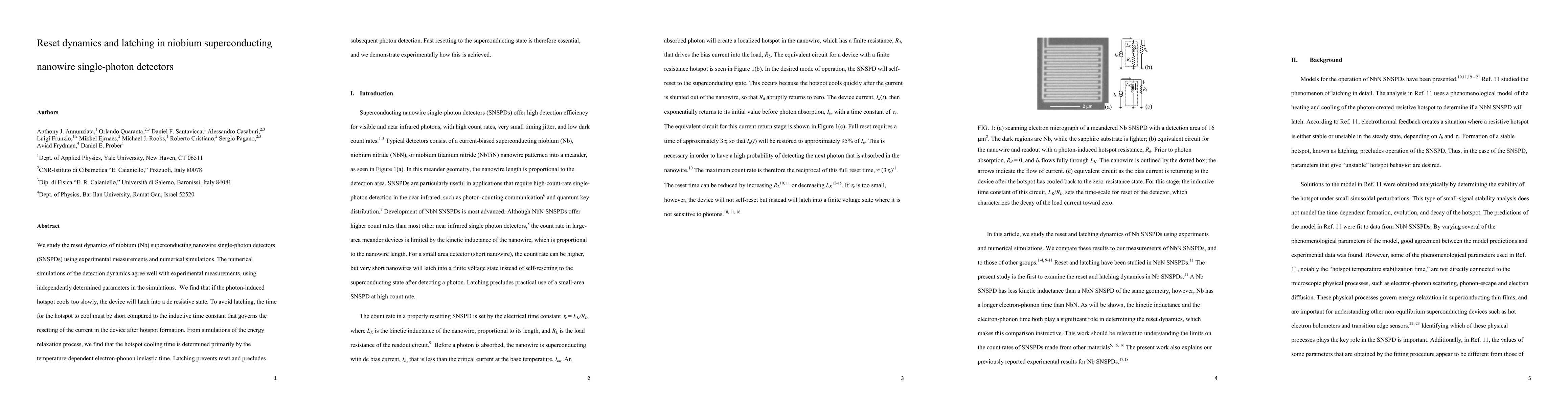 This paper investigates the reset dynamics and latching behavior in niobium superconducting nanowire single-photon detectors (SNSPDs) through experimental and numerical methods. It finds that slow cooling of photon-induced hotspots can cause latching, preventing reset and subsequent detection, emphasizing the importance of rapid resetting to the superconducting state.