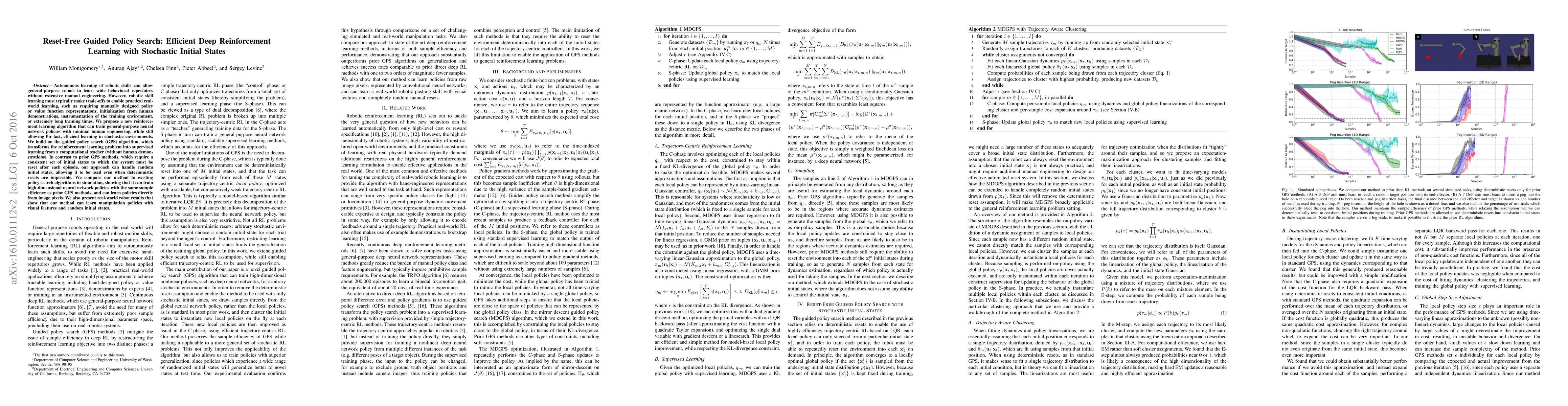 Autonomous learning of robotic skills can allow general-purpose robots to learn wide behavioral repertoires without requiring extensive manual engineering. However, robotic skill learning methods typically make one of several trade-offs to enable practical real-world learning, such as requiring manually designed policy or value function representations, initialization from human-provided demonstrations, instrumentation of the training environment, or extremely long training times. In this paper, we propose a new reinforcement learning algorithm for learning manipulation skills that can train general-purpose neural network policies with minimal human engineering, while still allowing for fast, efficient learning in stochastic environments. Our approach builds on the guided policy search (GPS) algorithm, which transforms the reinforcement learning problem into supervised learning from a computational teacher (without human demonstrations). In contrast to prior GPS methods, which require a consistent set of initial states to which the system must be reset after each episode, our approach can handle randomized initial states, allowing it to be used in environments where deterministic resets are impossible. We compare our method to existing policy search techniques in simulation, showing that it can train high-dimensional neural network policies with the same sample efficiency as prior GPS methods, and present real-world results on a PR2 robotic manipulator.