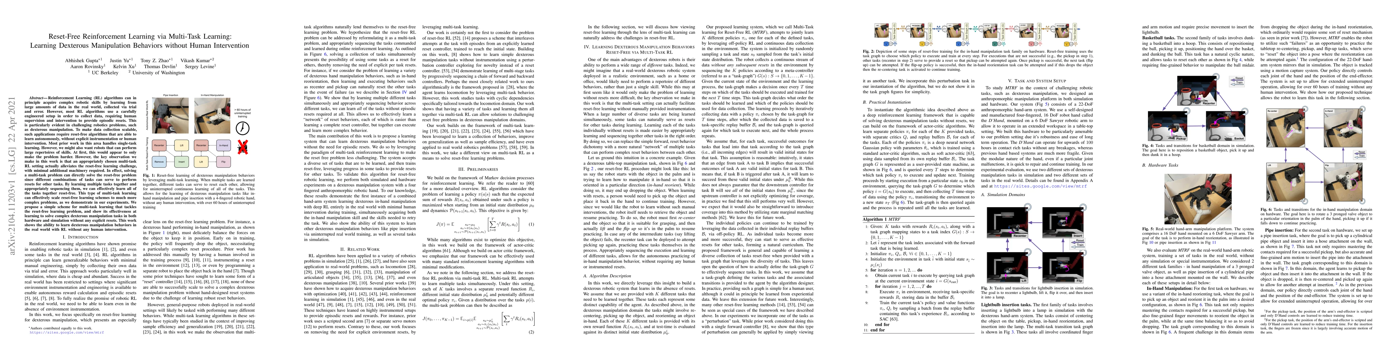 This paper proposes a reset-free reinforcement learning approach using multi-task learning to enable robots to autonomously acquire dexterous manipulation skills without human intervention. By leveraging different task combinations to perform resets, the method effectively learns complex manipulation behaviors in both simulation and real hardware.