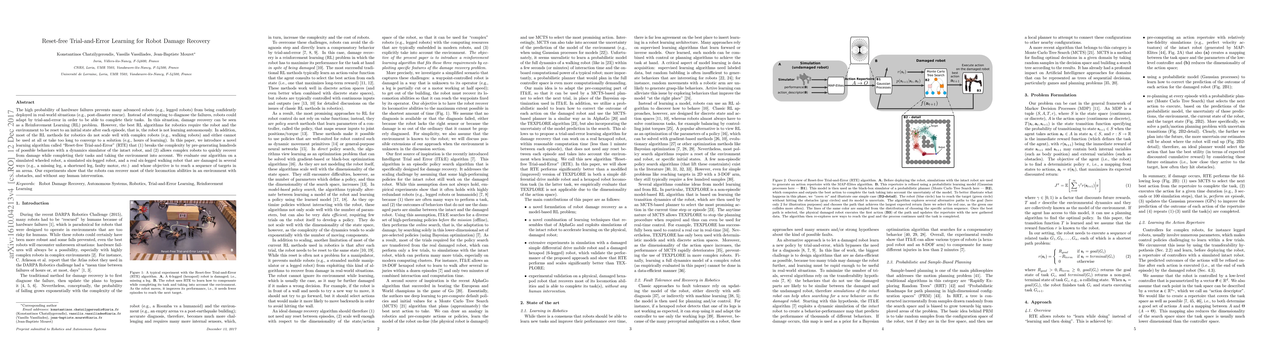 This paper introduces a novel "Reset-free Trial-and-Error" (RTE) learning algorithm that enables complex robots to autonomously recover from damage without requiring environment resets, by pre-generating possible behaviors using a dynamics simulator. Experiments demonstrate that the algorithm allows simulated and real robots to regain locomotion abilities in obstacle-laden environments post-damage.
