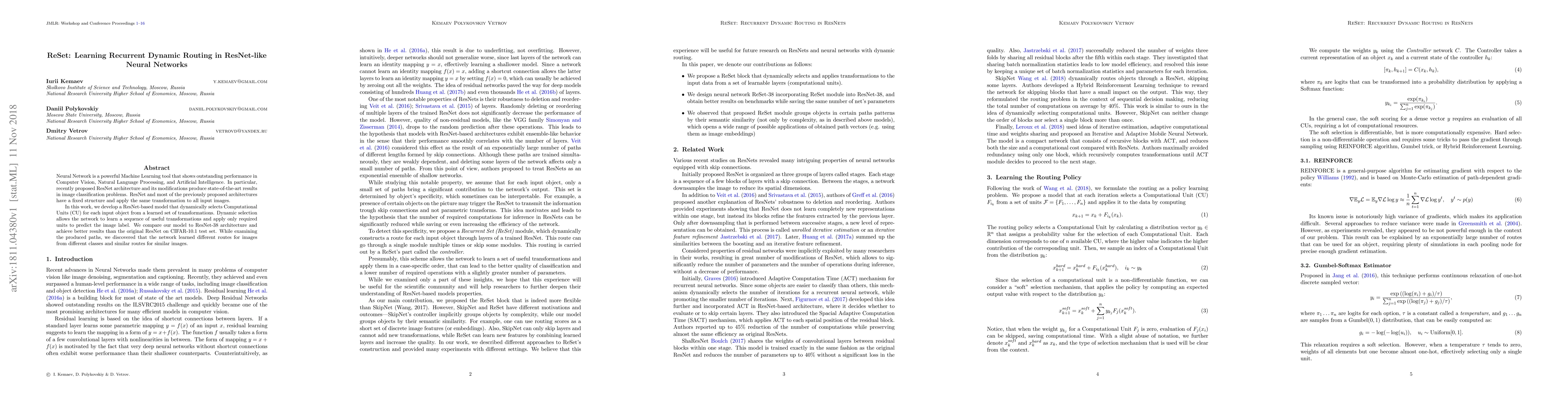 Neural Network is a powerful Machine Learning tool that shows outstanding performance in Computer Vision, Natural Language Processing, and Artificial Intelligence. In particular, recently proposed ResNet architecture and its modifications produce state-of-the-art results in image classification problems. ResNet and most of the previously proposed architectures have a fixed structure and apply the same transformation to all input images. In this work, we develop a ResNet-based model that dynamically selects Computational Units (CU) for each input object from a learned set of transformations. Dynamic selection allows the network to learn a sequence of useful transformations and apply only required units to predict the image label. We compare our model to ResNet-38 architecture and achieve better results than the original ResNet on CIFAR-10.1 test set. While examining the produced paths, we discovered that the network learned different routes for images from different classes and similar routes for similar images.
