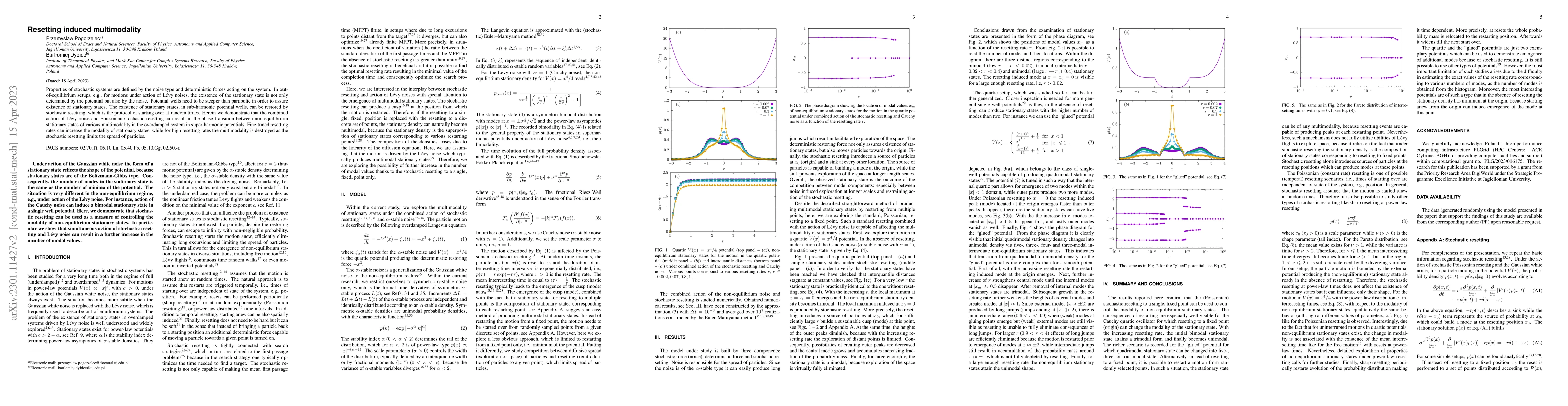 Properties of stochastic systems are defined by the noise type and deterministic forces acting on the system. In out-of-equilibrium setups, e.g., for motions under action of L\'evy noises, the existence of the stationary state is not only determined by the potential but also by the noise. Potential wells need to be steeper than parabolic in order to assure existence of stationary states. The existence of stationary states, in sub-harmonic potential wells, can be restored by stochastic resetting, which is the protocol of starting over at random times. Herein we demonstrate that the combined action of L\'evy noise and Poissonian stochastic resetting can result in the phase transition between non-equilibrium stationary states of various multimodality in the overdamped system in super-harmonic potentials. Fine-tuned resetting rates can increase the modality of stationary states, while for high resetting rates the multimodality is destroyed as the stochastic resetting limits the spread of particles.
