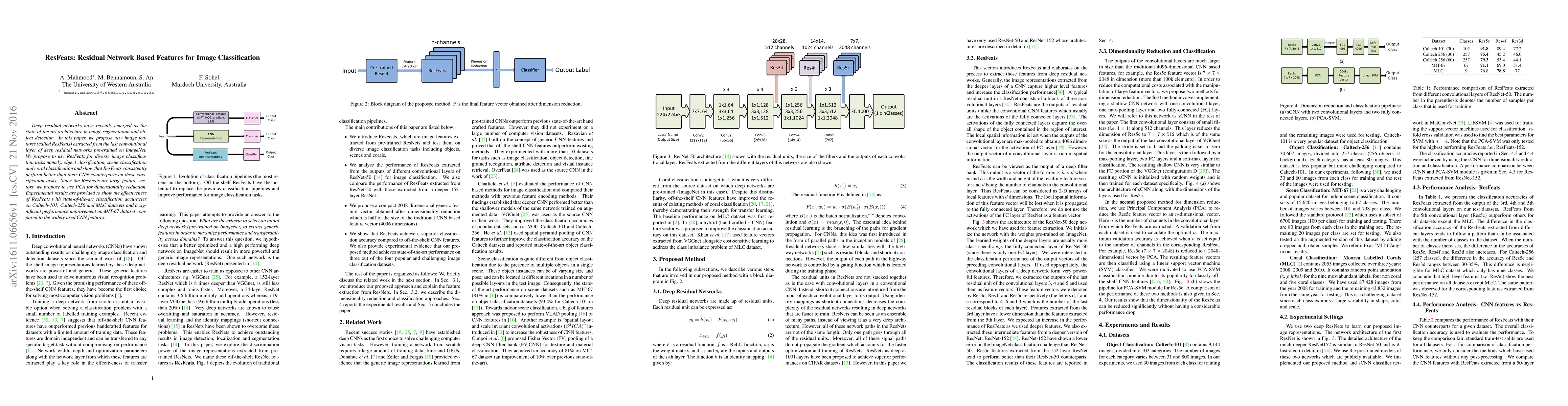 This paper introduces ResFeats, a novel feature extraction method derived from the last convolutional layer of pre-trained deep residual networks. The authors demonstrate that ResFeats outperform conventional CNN features across various image classification tasks, achieving state-of-the-art accuracies on multiple datasets. Dimensionality reduction via PCA is employed to manage the large feature vectors effectively.