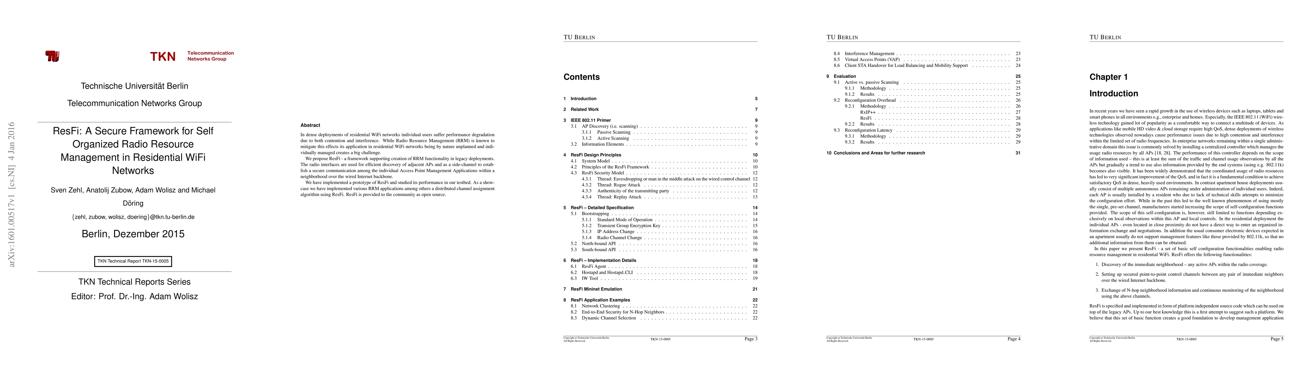 ResFi is a secure framework designed to enable Radio Resource Management (RRM) in unplanned, dense residential WiFi networks, addressing performance degradation from contention and interference. It utilizes radio interfaces for discovering adjacent access points and secure communication among them, implemented as an open-source prototype with a distributed channel assignment algorithm.