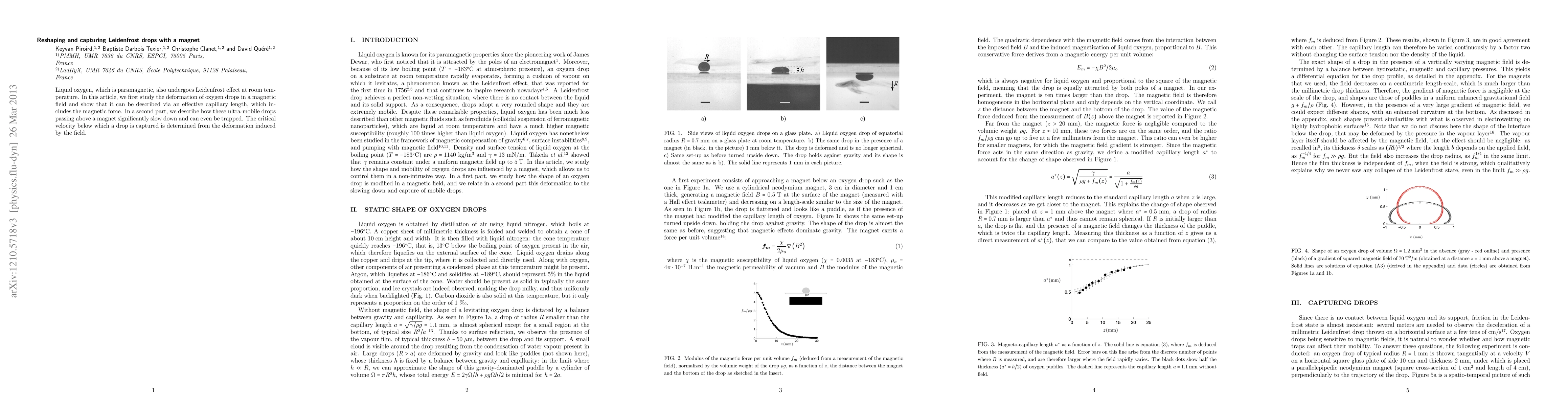 This paper investigates the deformation of paramagnetic liquid oxygen drops under a magnetic field and demonstrates that it can be described using an effective capillary length incorporating magnetic forces. It also shows that these highly mobile Leidenfrost drops can be slowed down and captured by a magnet, with the critical capture velocity determined by the magnetic-induced deformation.