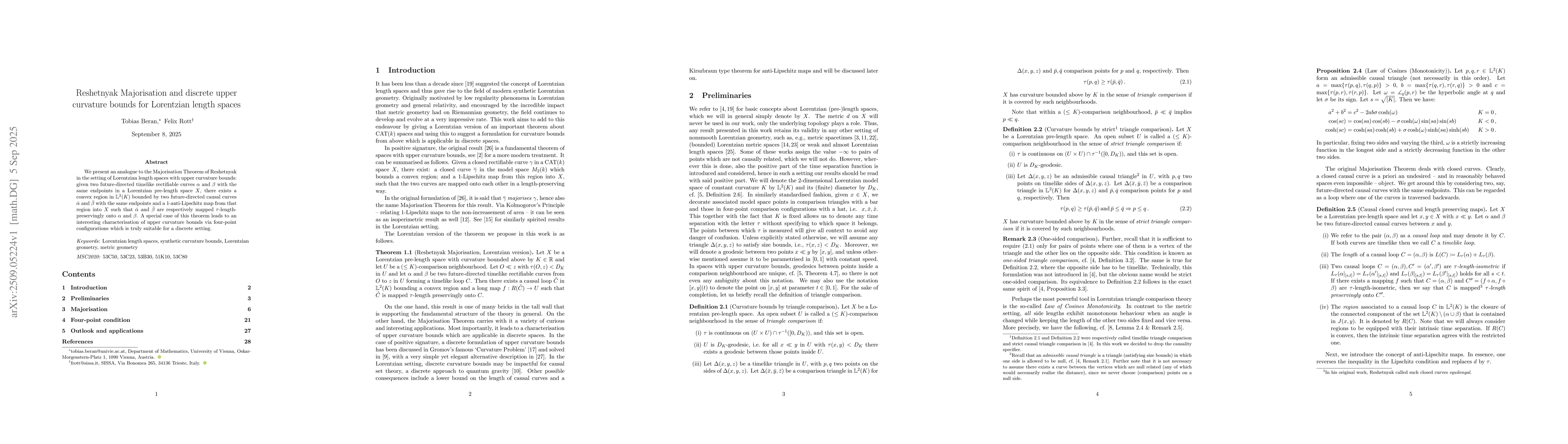 We present an analogue to the Majorisation Theorem of Reshetnyak in the setting of Lorentzian length spaces with upper curvature bounds: given two future-directed timelike rectifiable curves $\alpha$ and $\beta$ with the same endpoints in a Lorentzian length space $X$, there exists a convex region in $\mathbb{L}^2(K)$ bounded by two future-directed causal curves $\bar \alpha$ and $\bar \beta$ with the same endpoints and a 1-anti-Lipschitz map from that region into $X$ such that $\bar \alpha$ and $\bar \beta$ are respectively mapped $\tau$-length-preservingly onto $\alpha$ and $\beta$. A special case of this theorem leads to an interesting characterisation of upper curvature bounds via four-point configurations which is truly suitable for a discrete setting.