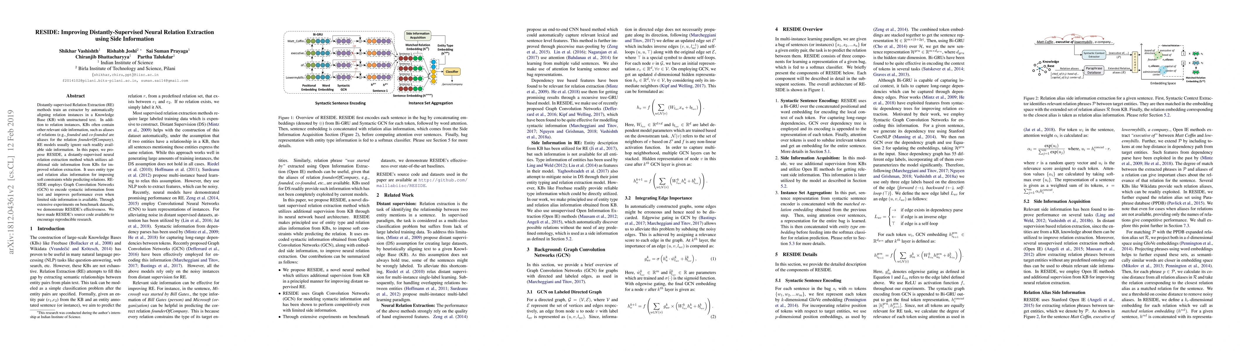 RESIDE enhances distantly-supervised neural relation extraction by leveraging side information from Knowledge Bases, such as relation aliases and entity types, to impose soft constraints and improve accuracy. It utilizes Graph Convolution Networks for syntactic text encoding and demonstrates effectiveness on benchmark datasets.