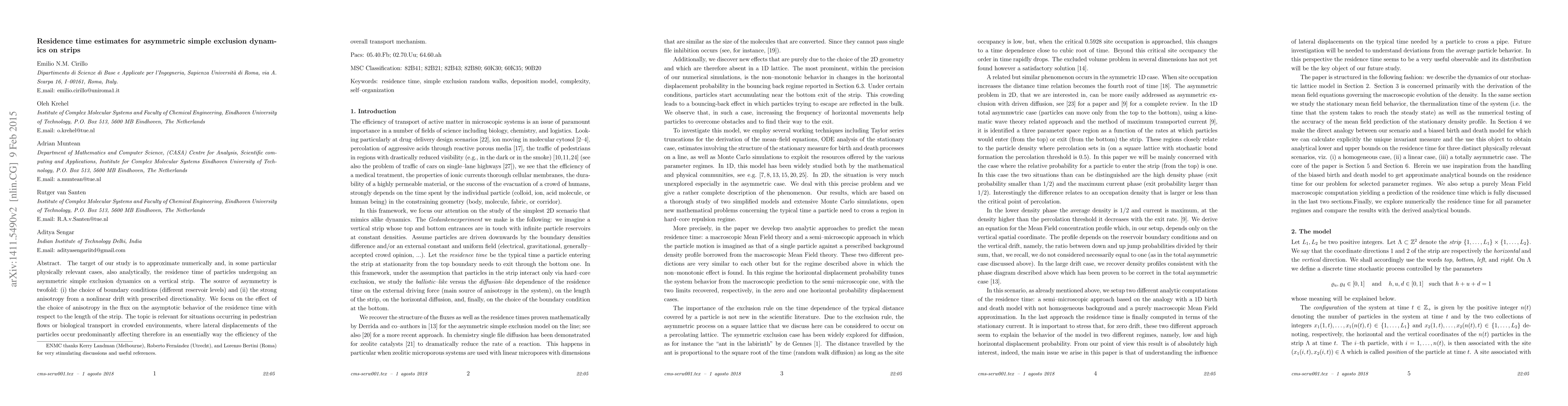 This paper numerically and analytically approximates the residence time of particles in asymmetric simple exclusion dynamics on a striped domain, focusing on the impact of anisotropic flux due to boundary conditions and directional drift. The findings are relevant for understanding pedestrian flows and biological transport in crowded environments.