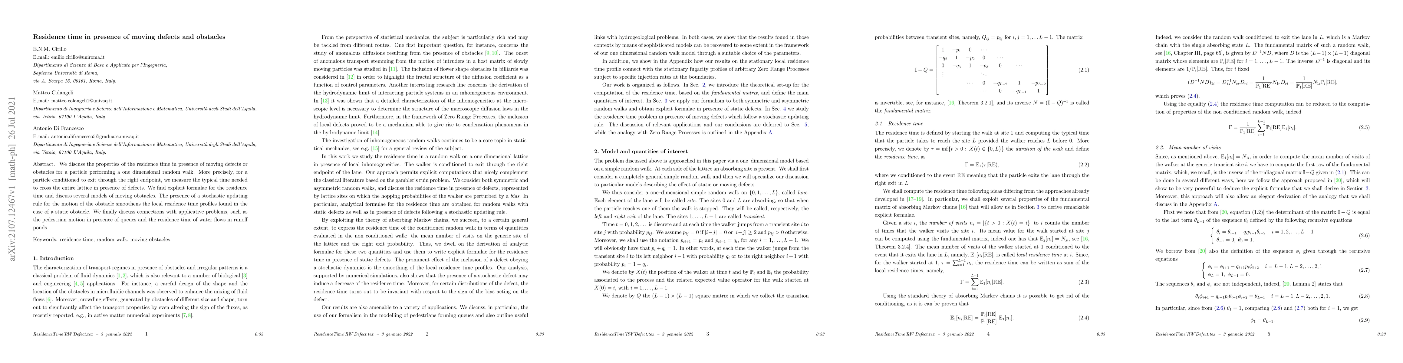 This paper investigates the residence time for a particle in a one-dimensional random walk influenced by moving defects or obstacles, deriving explicit formulae and analyzing various models of moving obstacles. The study finds that stochastic updates to obstacle motion smooth local residence time profiles compared to static obstacles and connects these findings to practical applications like pedestrian dynamics and water flow management.
