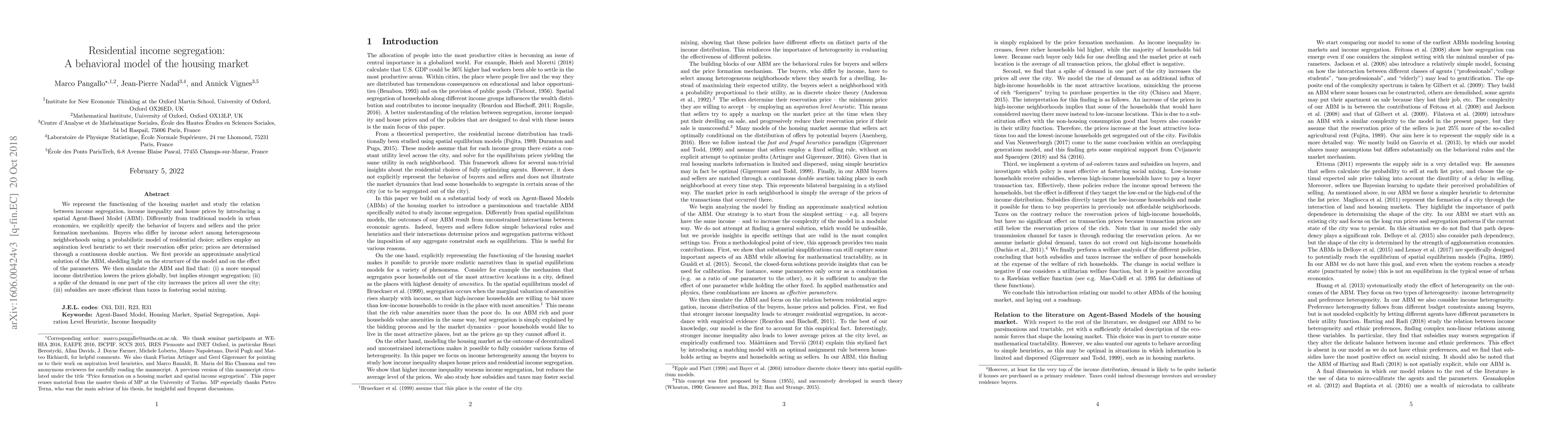 This paper uses an Agent-Based Model to explore how income segregation, inequality, and house prices interact in the housing market. It finds that income inequality lowers overall house prices but increases segregation, and that subsidies are more effective than taxes in promoting social mixing.