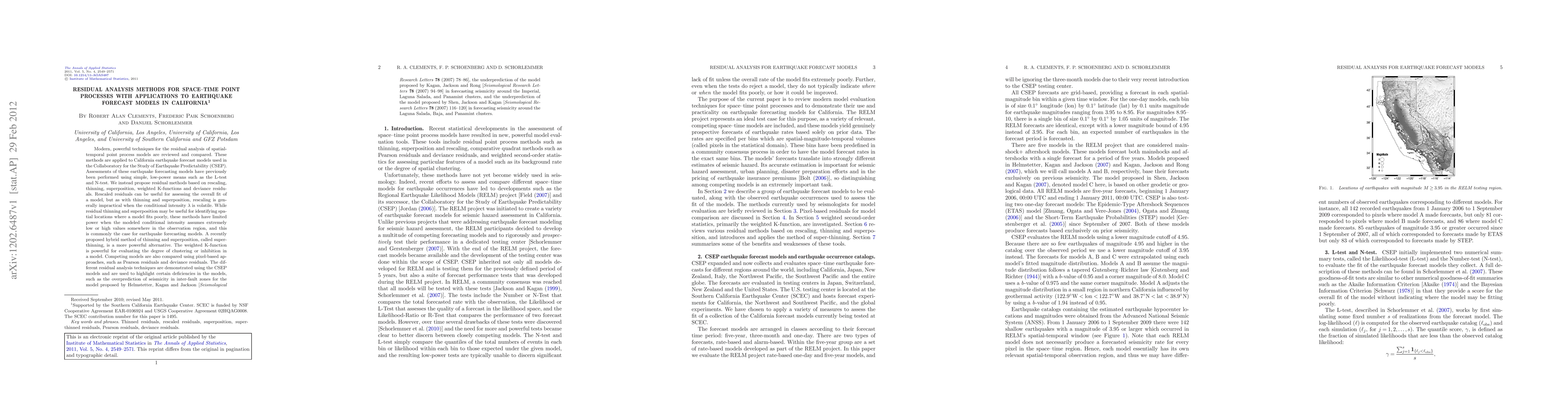 This paper reviews advanced residual analysis techniques for spatial-temporal point process models, applying them to California earthquake forecast models. It proposes methods like rescaling, thinning, superposition, weighted K-functions, and deviance residuals, finding that super-thinning is particularly effective for identifying model misfits.