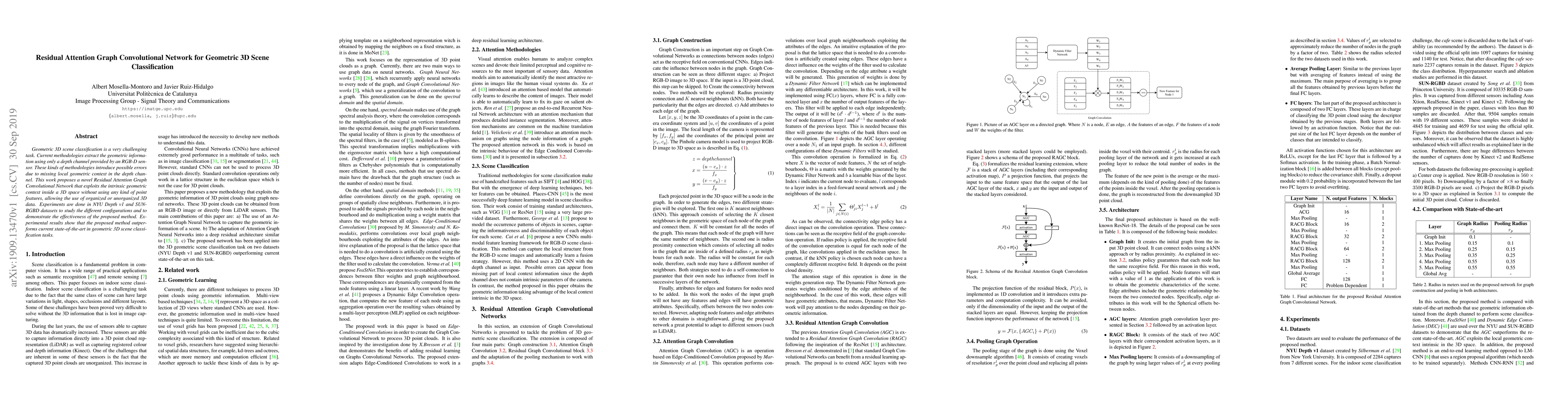 This paper introduces a Residual Attention Graph Convolutional Network to classify geometric 3D scenes, leveraging intrinsic geometric context without relying on point features. The method outperforms current state-of-the-art on NYU Depth v1 and SUN-RGBD datasets.