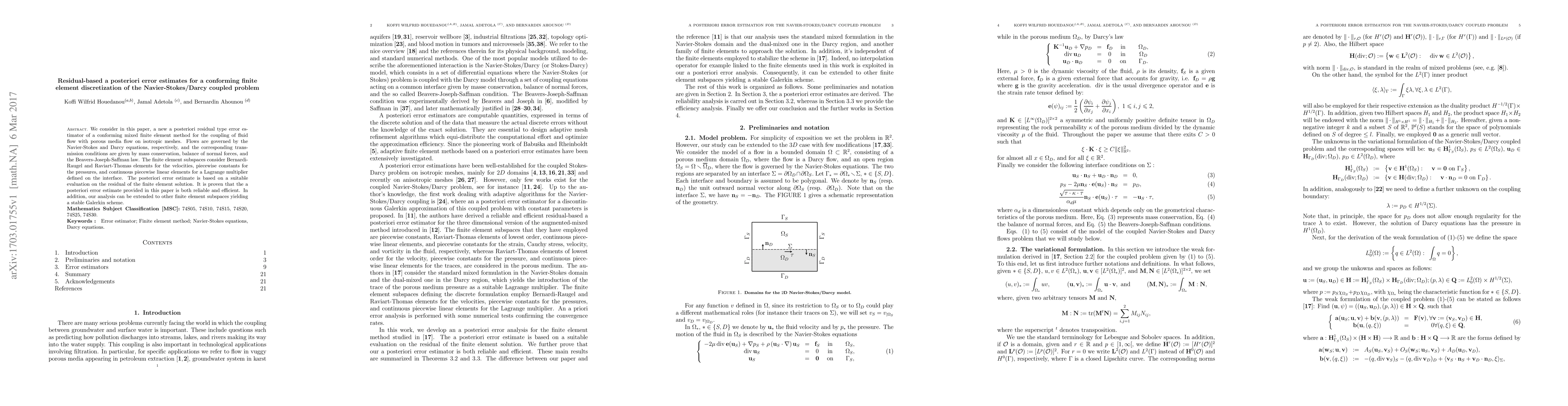 We consider in this paper, a new a posteriori residual type error estimator of a conforming mixed finite element method for the coupling of fluid flow with porous media flow on isotropic meshes. Flows are governed by the Navier-Stokes and Darcy equations, respectively, and the corresponding transmission conditions are given by mass conservation, balance of normal forces, and the Beavers-Joseph-Saffman law. The finite element subspaces consider Bernardi-Raugel and Raviart-Thomas elements for the velocities, piecewise constants for the pressures, and continuous piecewise linear elements for a Lagrange multiplier defined on the interface. The posteriori error estimate is based on a suitable evaluation on the residual of the finite element solution. It is proven that the a posteriori error estimate provided in this paper is both reliable and efficient. In addition, our analysis can be extended to other finite element subspaces yielding a stable Galerkin scheme.