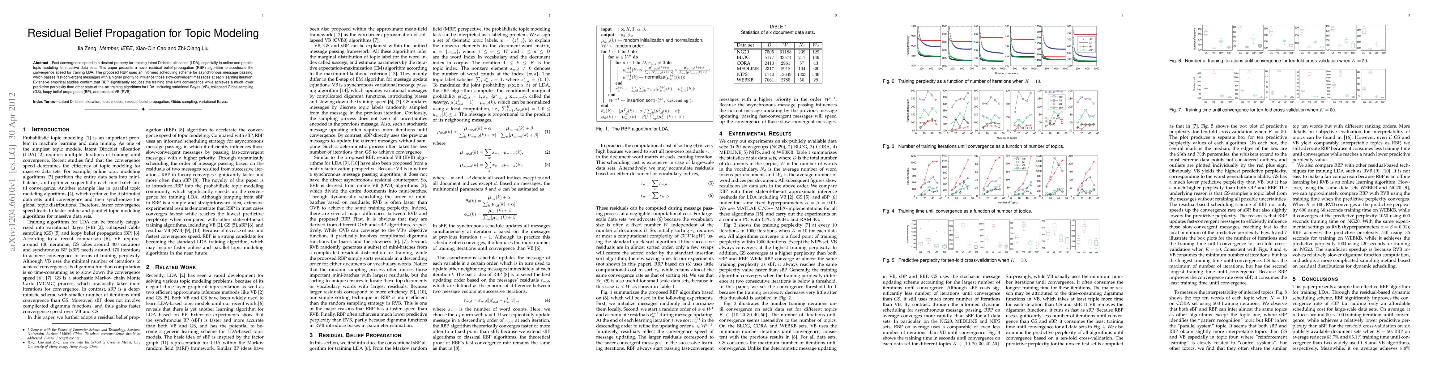 This paper introduces a novel residual belief propagation (RBP) algorithm to accelerate the training of latent Dirichlet allocation (LDA) for massive datasets. RBP prioritizes fast-convergent messages in asynchronous message passing, significantly reducing training time and achieving lower predictive perplexity compared to other methods.