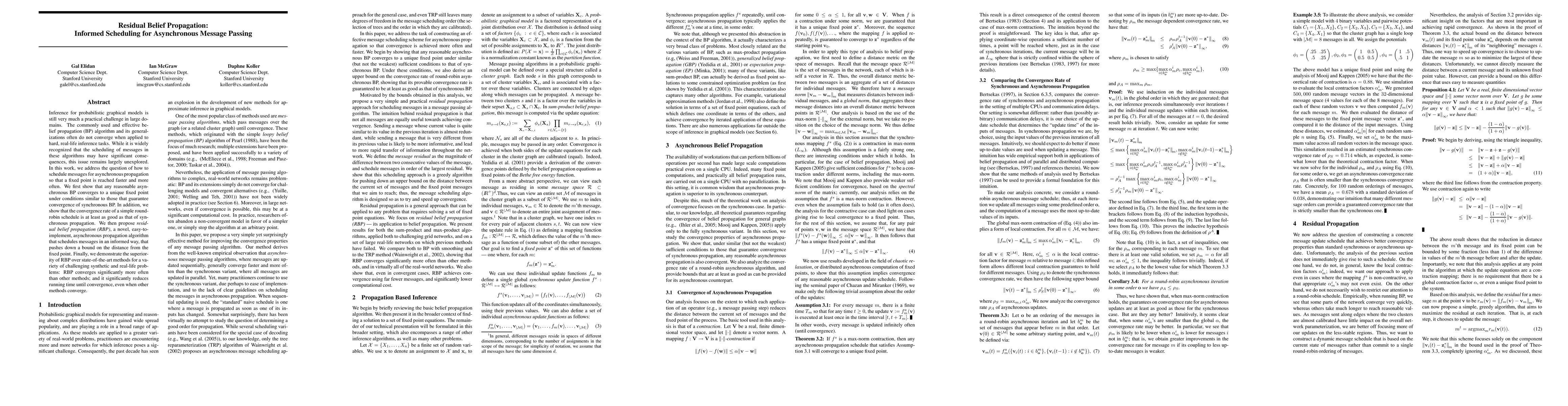 This paper proposes residual belief propagation (RBP), an informed scheduling method for asynchronous message passing in probabilistic graphical models, which significantly improves convergence rates and frequency compared to state-of-the-art methods. RBP schedules messages to minimize the distance from a fixed point, demonstrating superior performance in both synthetic and real-life inference tasks.