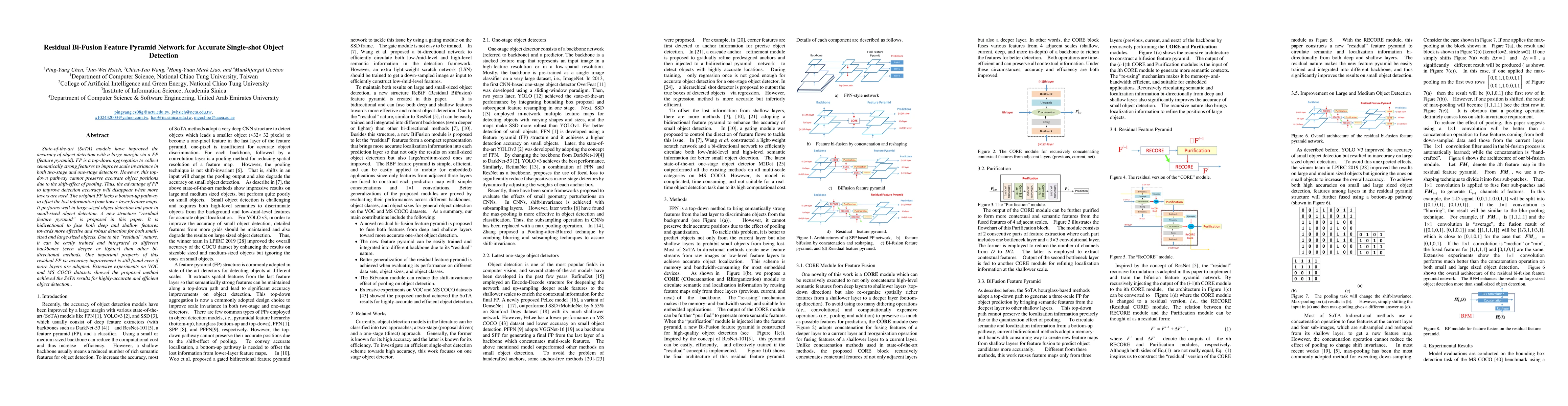 This paper proposes a Residual Bi-Fusion Feature Pyramid Network to enhance single-shot object detection accuracy by effectively fusing both deep and shallow features, addressing the shift-effect of pooling in traditional feature pyramids. The method achieves state-of-the-art results on VOC and MS COCO datasets, demonstrating improved performance for both small and large objects even with more layers.
