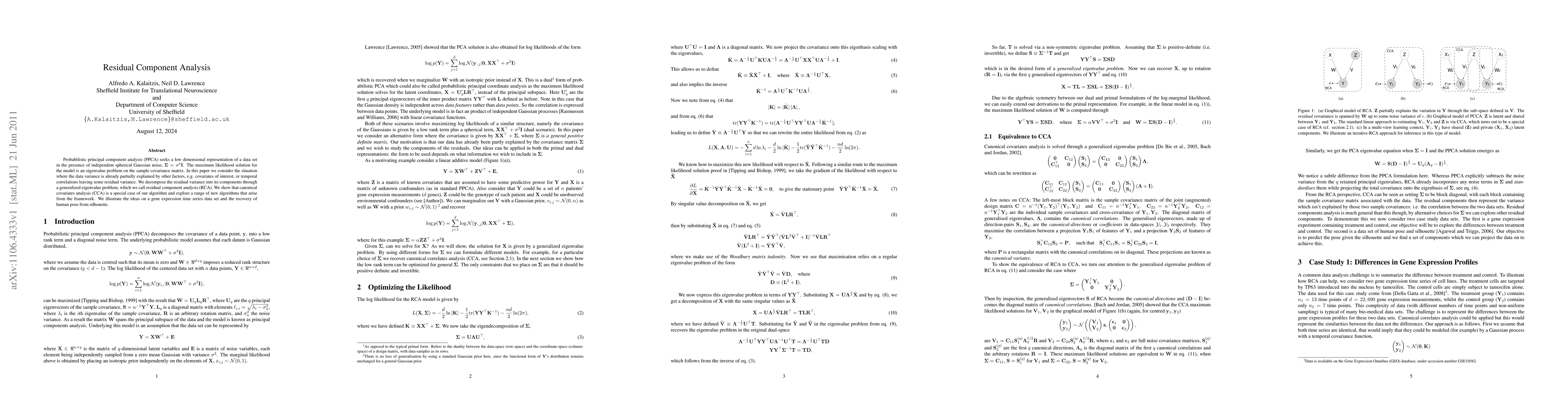 Probabilistic principal component analysis (PPCA) seeks a low dimensional representation of a data set in the presence of independent spherical Gaussian noise, Sigma = (sigma^2)*I. The maximum likelihood solution for the model is an eigenvalue problem on the sample covariance matrix. In this paper we consider the situation where the data variance is already partially explained by other factors, e.g. covariates of interest, or temporal correlations leaving some residual variance. We decompose the residual variance into its components through a generalized eigenvalue problem, which we call residual component analysis (RCA). We show that canonical covariates analysis (CCA) is a special case of our algorithm and explore a range of new algorithms that arise from the framework. We illustrate the ideas on a gene expression time series data set and the recovery of human pose from silhouette.
