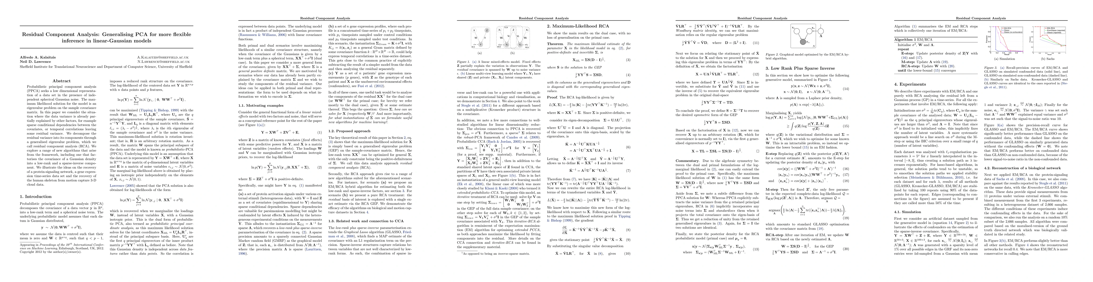 Probabilistic principal component analysis (PPCA) seeks a low dimensional representation of a data set in the presence of independent spherical Gaussian noise. The maximum likelihood solution for the model is an eigenvalue problem on the sample covariance matrix. In this paper we consider the situation where the data variance is already partially explained by other actors, for example sparse conditional dependencies between the covariates, or temporal correlations leaving some residual variance. We decompose the residual variance into its components through a generalised eigenvalue problem, which we call residual component analysis (RCA). We explore a range of new algorithms that arise from the framework, including one that factorises the covariance of a Gaussian density into a low-rank and a sparse-inverse component. We illustrate the ideas on the recovery of a protein-signaling network, a gene expression time-series data set and the recovery of the human skeleton from motion capture 3-D cloud data.
