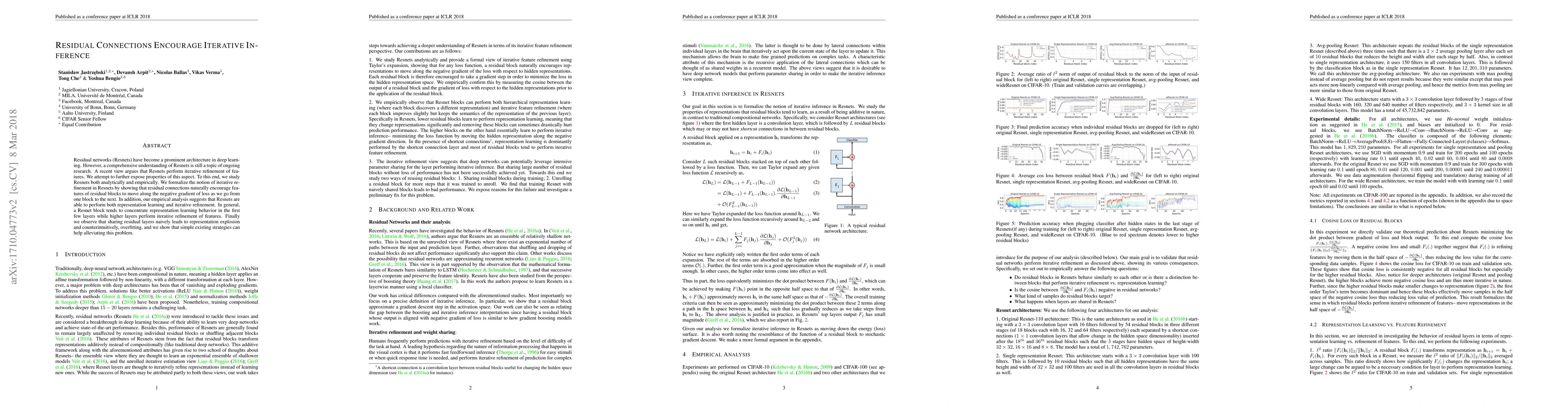 Residual networks (Resnets) have become a prominent architecture in deep learning. However, a comprehensive understanding of Resnets is still a topic of ongoing research. A recent view argues that Resnets perform iterative refinement of features. We attempt to further expose properties of this aspect. To this end, we study Resnets both analytically and empirically. We formalize the notion of iterative refinement in Resnets by showing that residual connections naturally encourage features of residual blocks to move along the negative gradient of loss as we go from one block to the next. In addition, our empirical analysis suggests that Resnets are able to perform both representation learning and iterative refinement. In general, a Resnet block tends to concentrate representation learning behavior in the first few layers while higher layers perform iterative refinement of features. Finally we observe that sharing residual layers naively leads to representation explosion and counterintuitively, overfitting, and we show that simple existing strategies can help alleviating this problem.