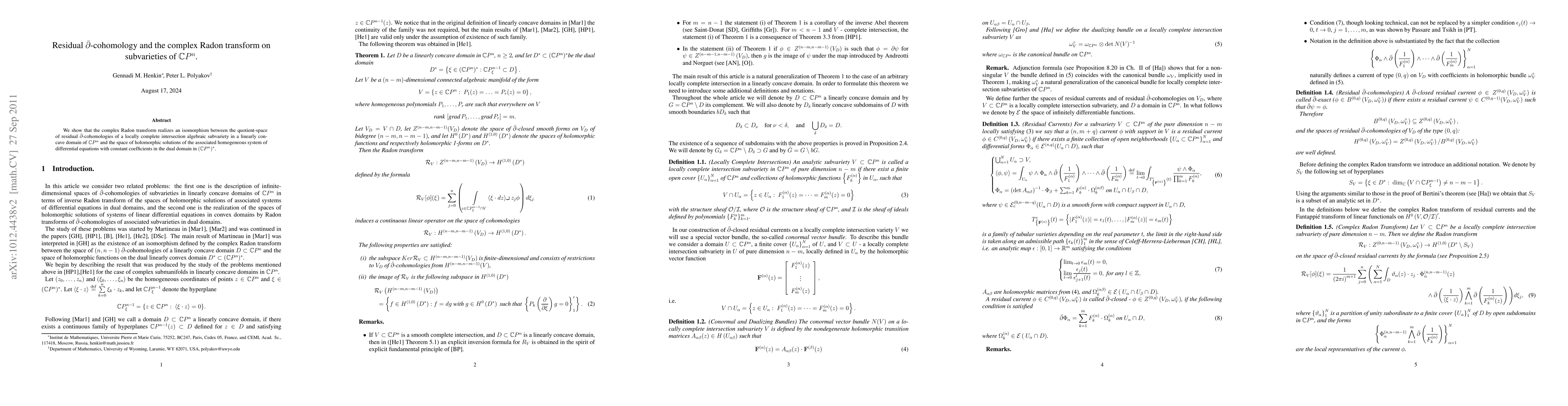We show that the complex Radon transform realizes an isomorphism between the space of residual $\bar\partial$-cohomologies of a locally complete intersection subvariety in a linearly concave domain of ${\C}P^n$ and the space of holomorphic solutions of the associated homogeneous system of differential equations withconstant coefficients in the dual domain in $({\C}P^n)^*$.