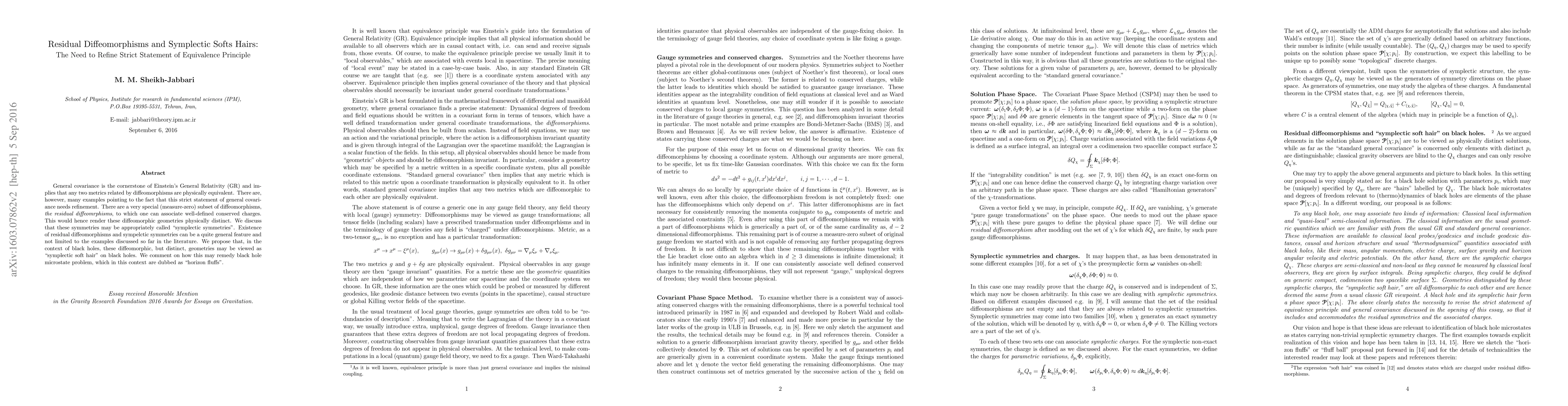 This paper argues for refining the strict statement of general covariance in GR by introducing residual diffeomorphisms and their associated conserved charges, termed "symplectic soft hairs," which distinguish physically distinct geometries. These findings may help resolve the black hole microstate problem by introducing "horizon fluffs."