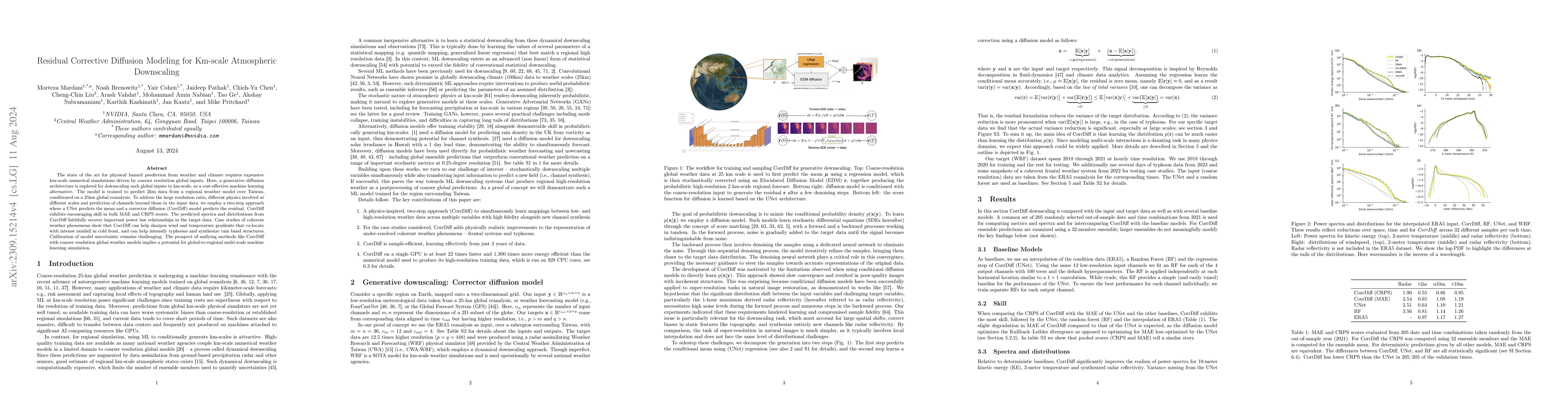 Predictions of weather hazard require expensive km-scale simulations driven by coarser global inputs. Here, a cost-effective stochastic downscaling model is trained from a high-resolution 2-km weather model over Taiwan conditioned on 25-km ERA5 reanalysis. To address the multi-scale machine learning challenges of weather data, we employ a two-step approach Corrector Diffusion (\textit{CorrDiff}), where a UNet prediction of the mean is corrected by a diffusion step. Akin to Reynolds decomposition in fluid dynamics, this isolates generative learning to the stochastic scales. \textit{CorrDiff} exhibits skillful RMSE and CRPS and faithfully recovers spectra and distributions even for extremes. Case studies of coherent weather phenomena reveal appropriate multivariate relationships reminiscent of learnt physics: the collocation of intense rainfall and sharp gradients in fronts and extreme winds and rainfall bands near the eyewall of typhoons. Downscaling global forecasts successfully retains many of these benefits, foreshadowing the potential of end-to-end, global-to-km-scales machine learning weather predictions.