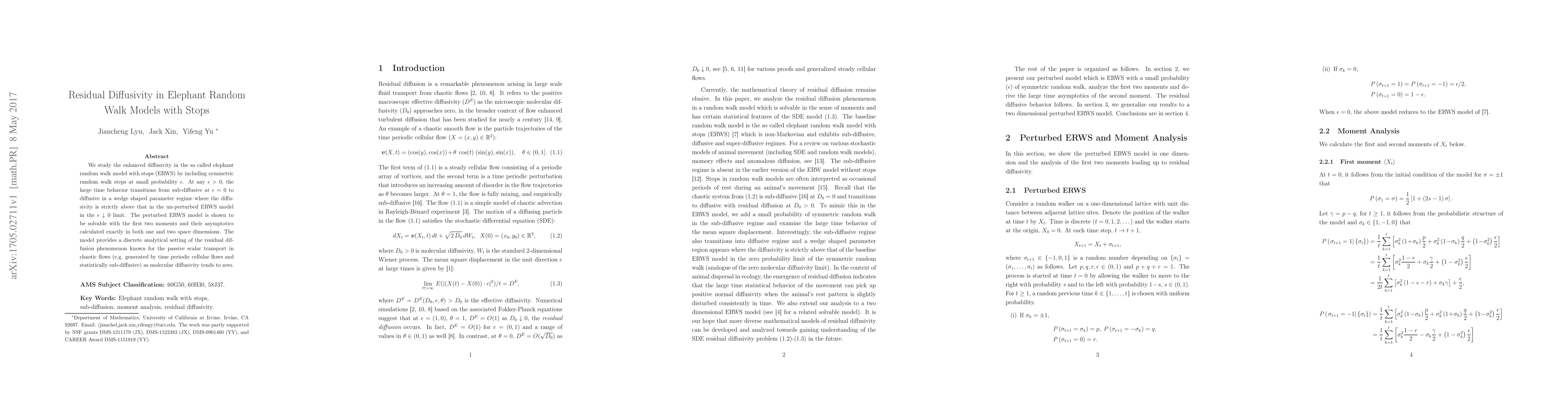 We study the enhanced diffusivity in the so called elephant random walk model with stops (ERWS) by including symmetric random walk steps at small probability $\epsilon$. At any $\epsilon > 0$, the large time behavior transitions from sub-diffusive at $\epsilon = 0$ to diffusive in a wedge shaped parameter regime where the diffusivity is strictly above that in the un-perturbed ERWS model in the $\epsilon \downarrow 0$ limit. The perturbed ERWS model is shown to be solvable with the first two moments and their asymptotics calculated exactly in both one and two space dimensions. The model provides a discrete analytical setting of the residual diffusion phenomenon known for the passive scalar transport in chaotic flows (e.g. generated by time periodic cellular flows and statistically sub-diffusive) as molecular diffusivity tends to zero.