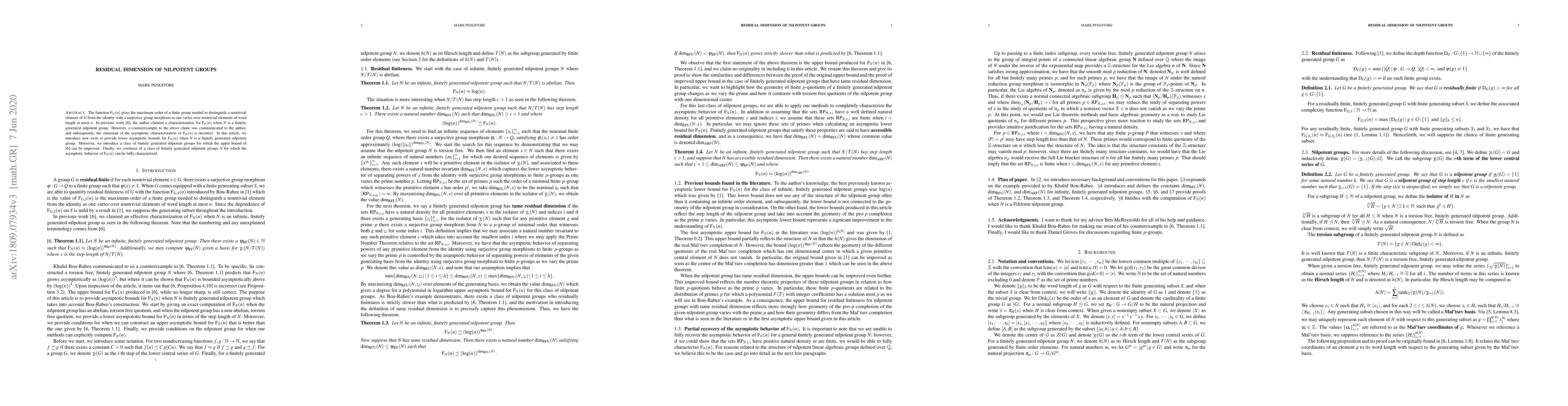 The paper corrects a previous claim about the asymptotic behavior of residual finiteness for finitely generated nilpotent groups, introducing new tools for lower bounds. It also presents a class of groups for improved upper bound application and characterizes the asymptotic behavior for a specific class of nilpotent groups.