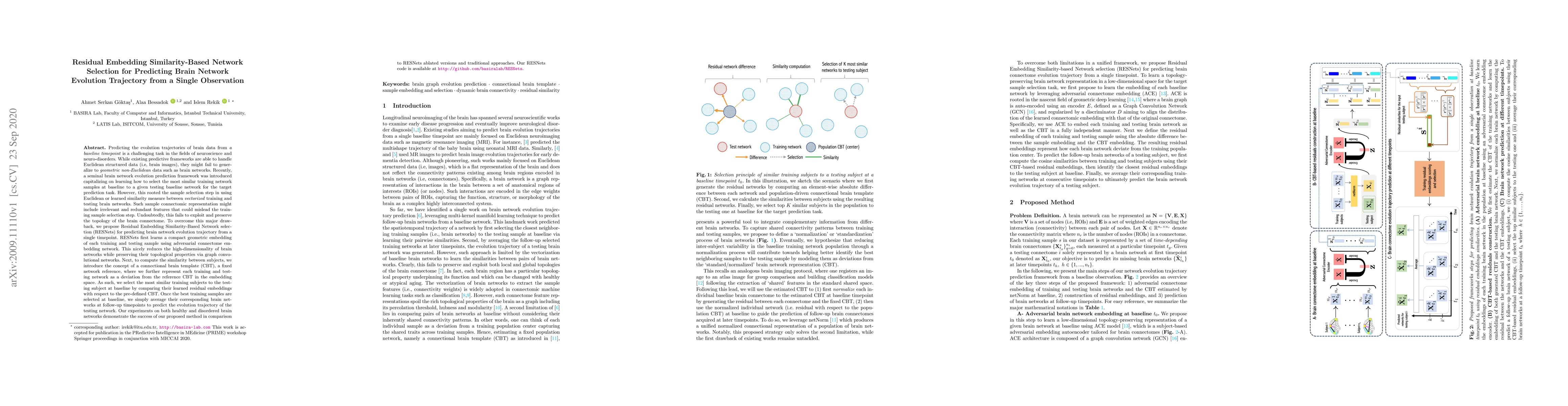 While existing predictive frameworks are able to handle Euclidean structured data (i.e, brain images), they might fail to generalize to geometric non-Euclidean data such as brain networks. Besides, these are rooted the sample selection step in using Euclidean or learned similarity measure between vectorized training and testing brain networks. Such sample connectomic representation might include irrelevant and redundant features that could mislead the training sample selection step. Undoubtedly, this fails to exploit and preserve the topology of the brain connectome. To overcome this major drawback, we propose Residual Embedding Similarity-Based Network selection (RESNets) for predicting brain network evolution trajectory from a single timepoint. RESNets first learns a compact geometric embedding of each training and testing sample using adversarial connectome embedding network. This nicely reduces the high-dimensionality of brain networks while preserving their topological properties via graph convolutional networks. Next, to compute the similarity between subjects, we introduce the concept of a connectional brain template (CBT), a fixed network reference, where we further represent each training and testing network as a deviation from the reference CBT in the embedding space. As such, we select the most similar training subjects to the testing subject at baseline by comparing their learned residual embeddings with respect to the pre-defined CBT. Once the best training samples are selected at baseline, we simply average their corresponding brain networks at follow-up timepoints to predict the evolution trajectory of the testing network. Our experiments on both healthy and disordered brain networks demonstrate the success of our proposed method in comparison to RESNets ablated versions and traditional approaches.