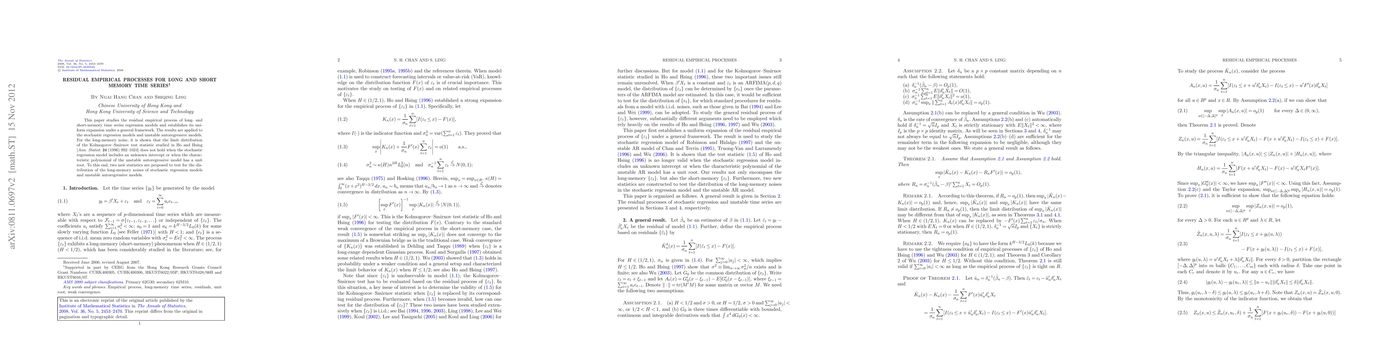 This paper studies the residual empirical process of long- and short-memory time series regression models and establishes its uniform expansion under a general framework. The results are applied to the stochastic regression models and unstable autoregressive models. For the long-memory noise, it is shown that the limit distribution of the Kolmogorov-Smirnov test statistic studied in Ho and Hsing [Ann. Statist. 24 (1996) 992-1024] does not hold when the stochastic regression model includes an unknown intercept or when the characteristic polynomial of the unstable autoregressive model has a unit root. To this end, two new statistics are proposed to test for the distribution of the long-memory noises of stochastic regression models and unstable autoregressive models. (With Correction.)