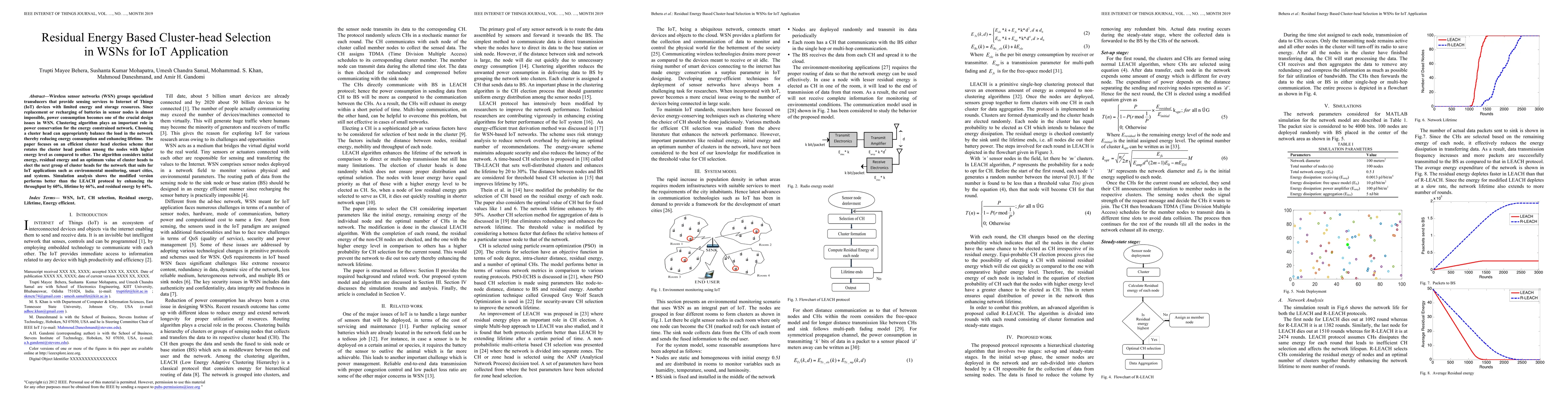 This paper proposes a residual energy-based cluster-head selection algorithm for wireless sensor networks in IoT applications, aiming to optimize energy consumption and extend network lifetime. The algorithm outperforms the LEACH protocol by increasing throughput, network lifetime, and residual energy by 60%, 66%, and 64% respectively.