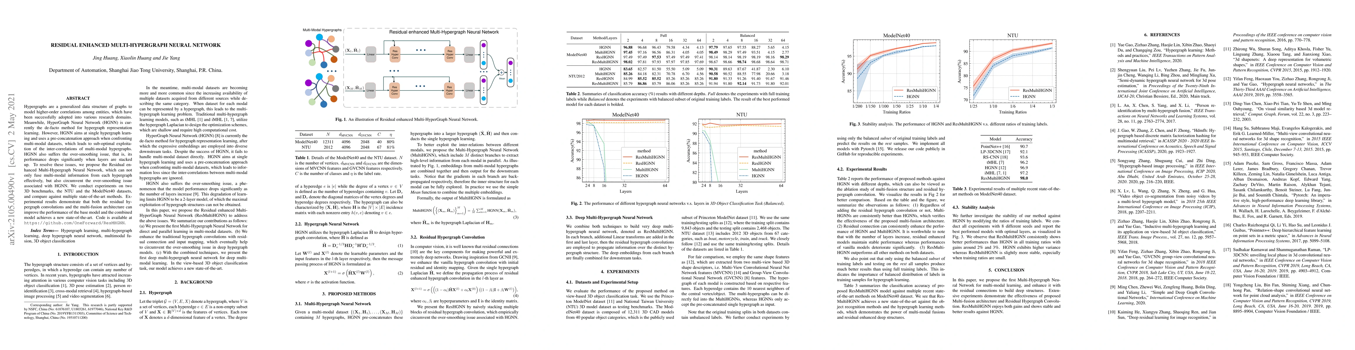 The paper proposes a Residual Enhanced Multi-Hypergraph Neural Network (ResMHGNN) to address the limitations of existing HyperGraph Neural Networks (HGNN) in multi-modal data and over-smoothing issues. The model achieves superior performance on 3D benchmarks, outperforming state-of-the-art methods.