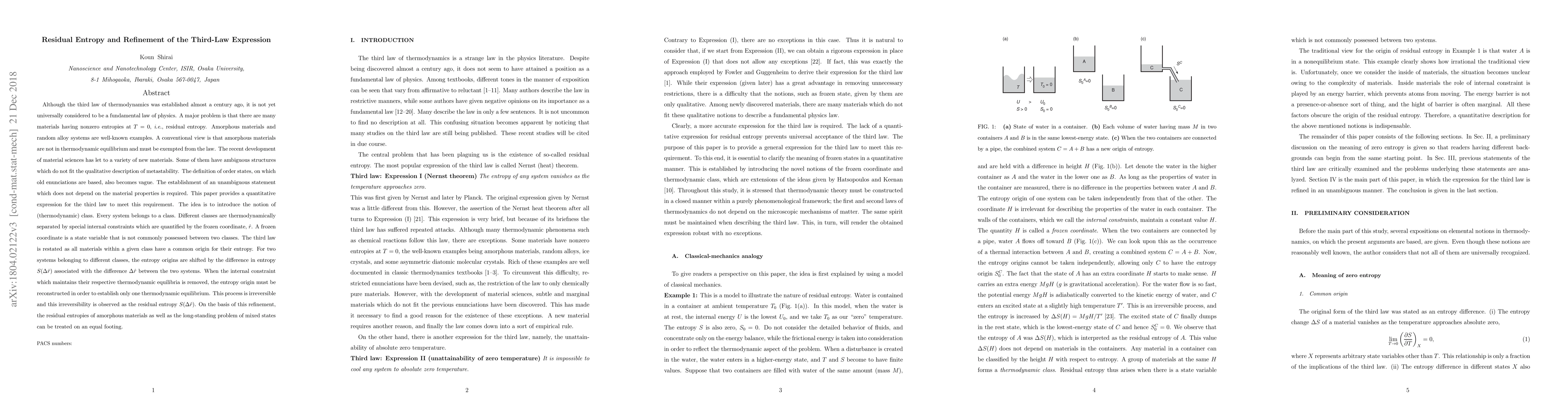 Although the third law of thermodynamics was established almost a century ago, it is not yet universally considered to be a fundamental law of physics. A major problem is that there are many materials having residual entropy. Amorphous materials and random alloy systems are well-known examples. A conventional view is that amorphous materials are not in thermodynamic equilibrium and must be exempted from the law. The recent development of material sciences has let to a variety of new materials. Some of them have ambiguous structures which do not fit the qualitative description of metastability. The definition of order states also becomes vague. The establishment of an unambiguous statement which does not depend on the material properties is required. This paper provides a quantitative expression for the third law to meet this requirement. The idea is to introduce the notion of class. Every system belongs to a class. Different classes are thermodynamically separated by special internal constraints which are quantified by the frozen coordinate, r. A frozen coordinate is a state variable that is not commonly possessed between two classes. The third law is restated as all materials within a given class have a common origin of entropy. For two systems belonging to different classes, the entropy origins are shifted by the difference in entropy associated with the difference r between the two systems. When the internal constraint is removed, the entropy origin must be reconstructed in order to establish only one thermodynamic equilibrium. This process is irreversible and this irreversibility is observed as the residual entropy. On the basis of this refinement, the residual entropies of amorphous materials as well as the long-standing problem of mixed states can be treated on an equal footing.