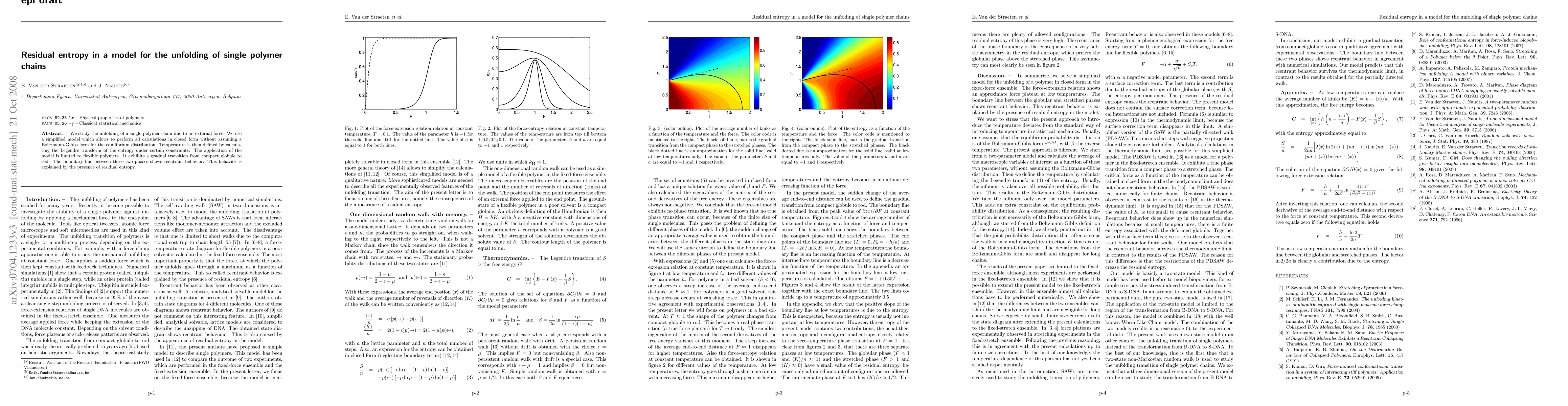 This paper investigates the unfolding of flexible polymer chains under external force using a simplified model that avoids assumptions about the equilibrium distribution. It reveals a gradual transition from compact globule to rod phase with a reentrant boundary line, explained by the presence of residual entropy.