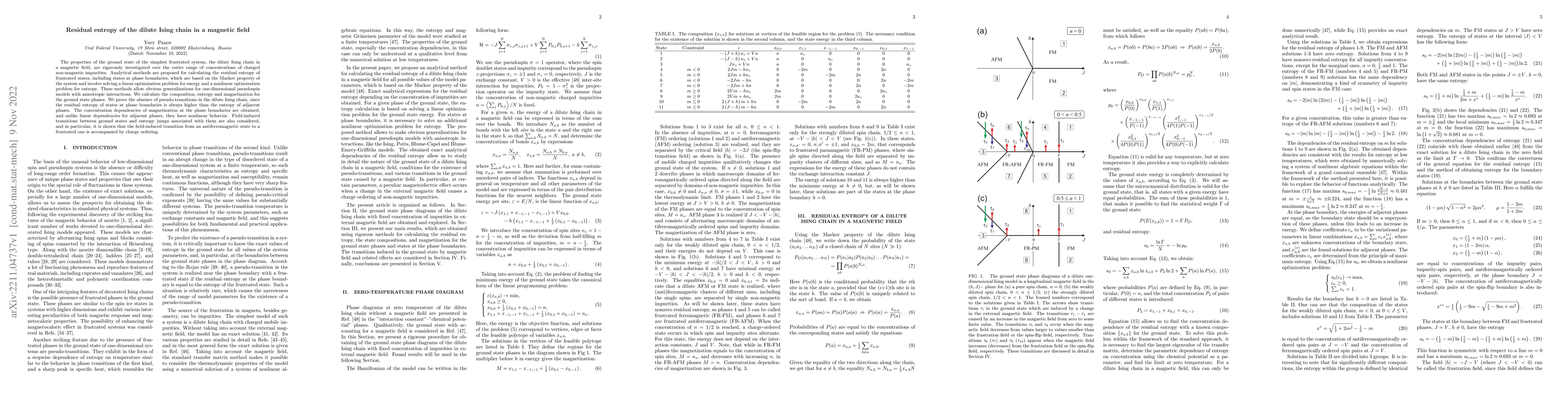 The properties of the ground state of the simplest frustrated system, the dilute Ising chain in a magnetic field, are rigorously investigated over the entire range of concentrations of charged non-magnetic impurities. Analytical methods are proposed for calculating the residual entropy of frustrated states, including states at phase boundaries, which are based on the Markov property of the system and involve solving a linear optimization problem for energy and a nonlinear optimization problem for entropy. These methods allow obvious generalizations for one-dimensional pseudospin models with anisotropic interactions. We calculate the composition, entropy and magnetization for the ground state phases. We prove the absence of pseudo-transitions in the dilute Ising chain, since the residual entropy of states at phase boundaries is always higher than the entropy of adjacent phases. The concentration dependencies of magnetization at the phase boundaries are obtained, and unlike linear dependencies for adjacent phases, they have nonlinear behavior. Field-induced transitions between ground states and entropy jumps associated with them are also considered, and in particular, it is shown that the field-induced transition from an antiferromagnetic state to a frustrated one is accompanied by charge ordering.